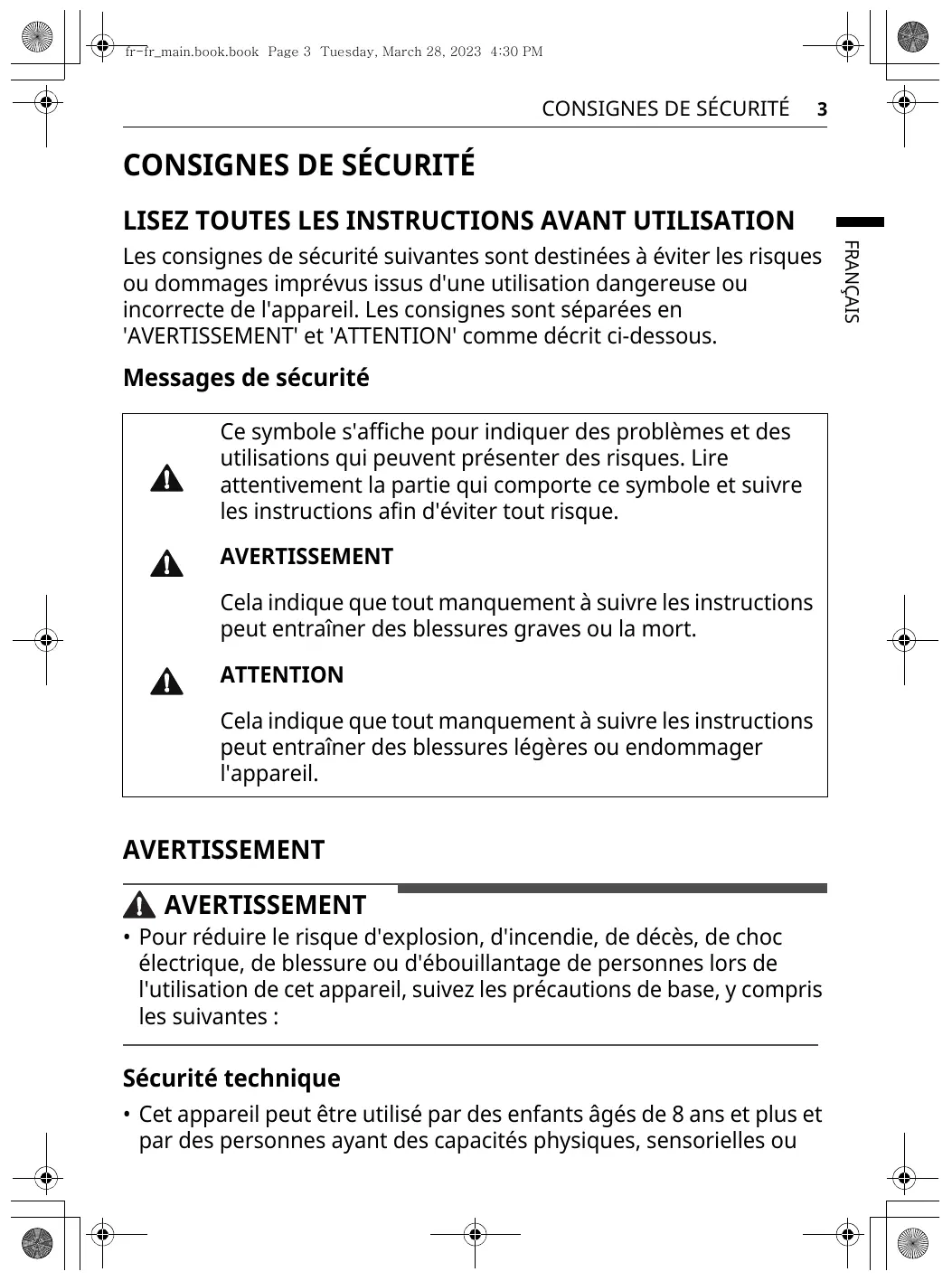 Les consignes de sécurité suivantes sont destinées à éviter les risques ou dommages imprévus issus d'une utilisation dangereuse ou incorrecte de l'appareil. Les consignes sont séparées en "AVERTISSEMENT" et 'ATTENTION' comme décrit ci-dessous. Messages de sécurité Ce symbole s'affiche pour indiquer des problèmes et des utilisations qui peuvent présenter des risques. Lire À attentivement la partie qui comporte ce symbole et suivre les instructions afin d'éviter tout risque. À AVERTISSEMENT Cela indique que tout manquement à suivre les instructions peut entraîner des blessures graves ou la mort. À À ATTENTION Cela indique que tout manquement à suivre les instructions peut entraîner des blessures légères ou endommager l'appareil. AVERTISSEMENT ELLE À AVERTISSEMENT + Pour réduire le risque d'explosion, d'incendie, de décès, de choc électrique, de blessure ou d'ébouillantage de personnes lors de l'utilisation de cet appareil, suivez les précautions de base, y compris les suivantes : Sécurité technique + Cet appareil peut être utilisé par des enfants âgés de 8 ans et plus et par des personnes ayant des capacités physiques, sensorielles ou