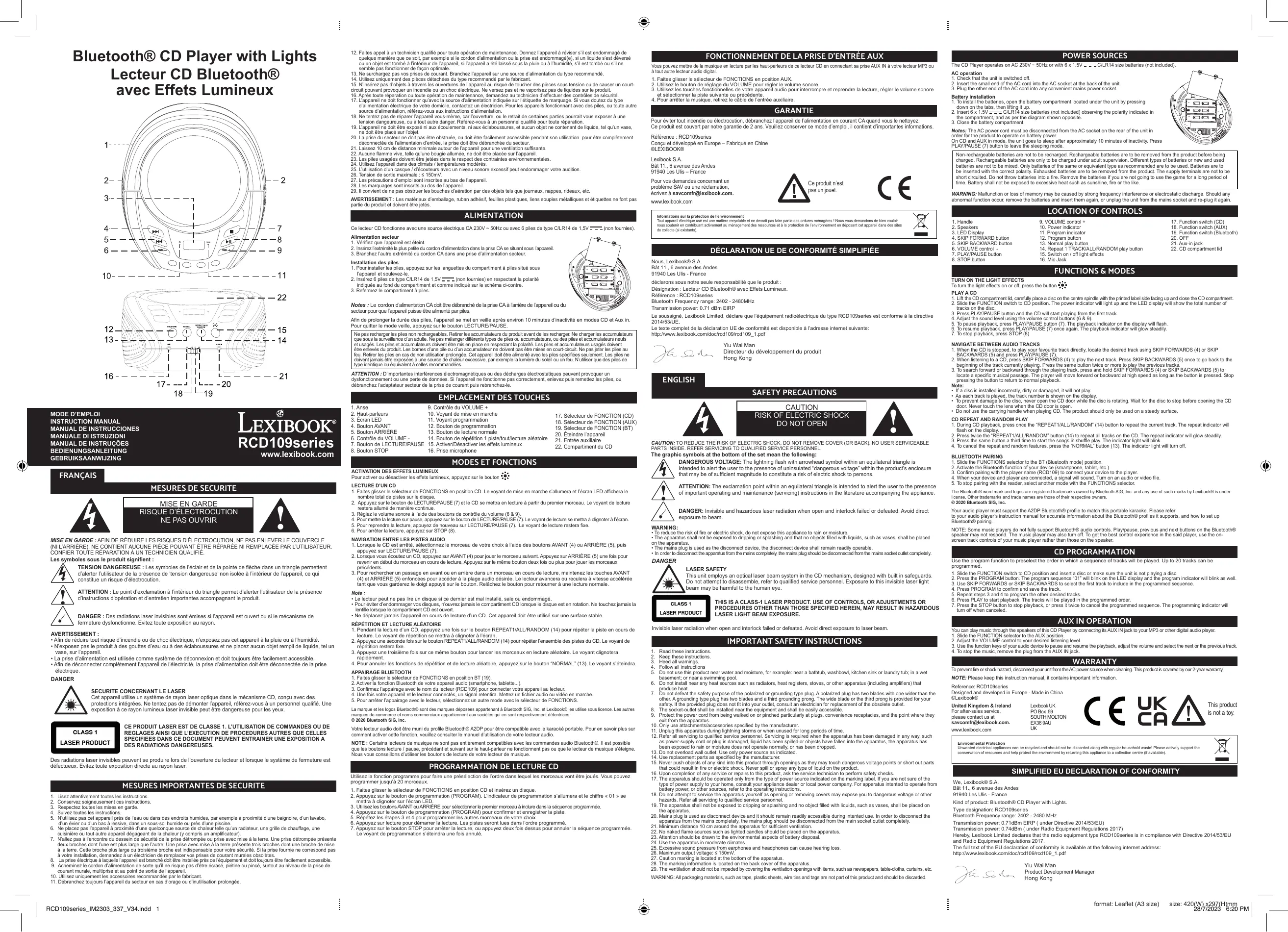 DÉCLARATION UE DE CONFORMITÉ SIMPLIFIÉE Nous, Lexibook® S À. Bat 11. 6 avenue des Andes: 91940 Les Uls - France déclarons sous notre seule responsabilité que le produit Désignation : Lecteur CD Bluetooth® avec Effets Lumineux. Référence : RCD109eries. Bluetooth Frequency range: 2402 - 2480MHz Transmission poner 0.71 dB EIRP Le soussigné, Lexbook Limited, déclare que l'équipement radioéiectique du type RCD 109saries est conforme à la directive 2OA/SSIUE. Le texte complet de Ia déclaration LE de conformité ect disponible à l'adresse intarnet suivante: hip Jexbook comldocirex 09e 109 pdf Yu Wai M Directeur du développement du produit Hong Kong ENGLISH SAFETY PRECAUTIONS CAUTION