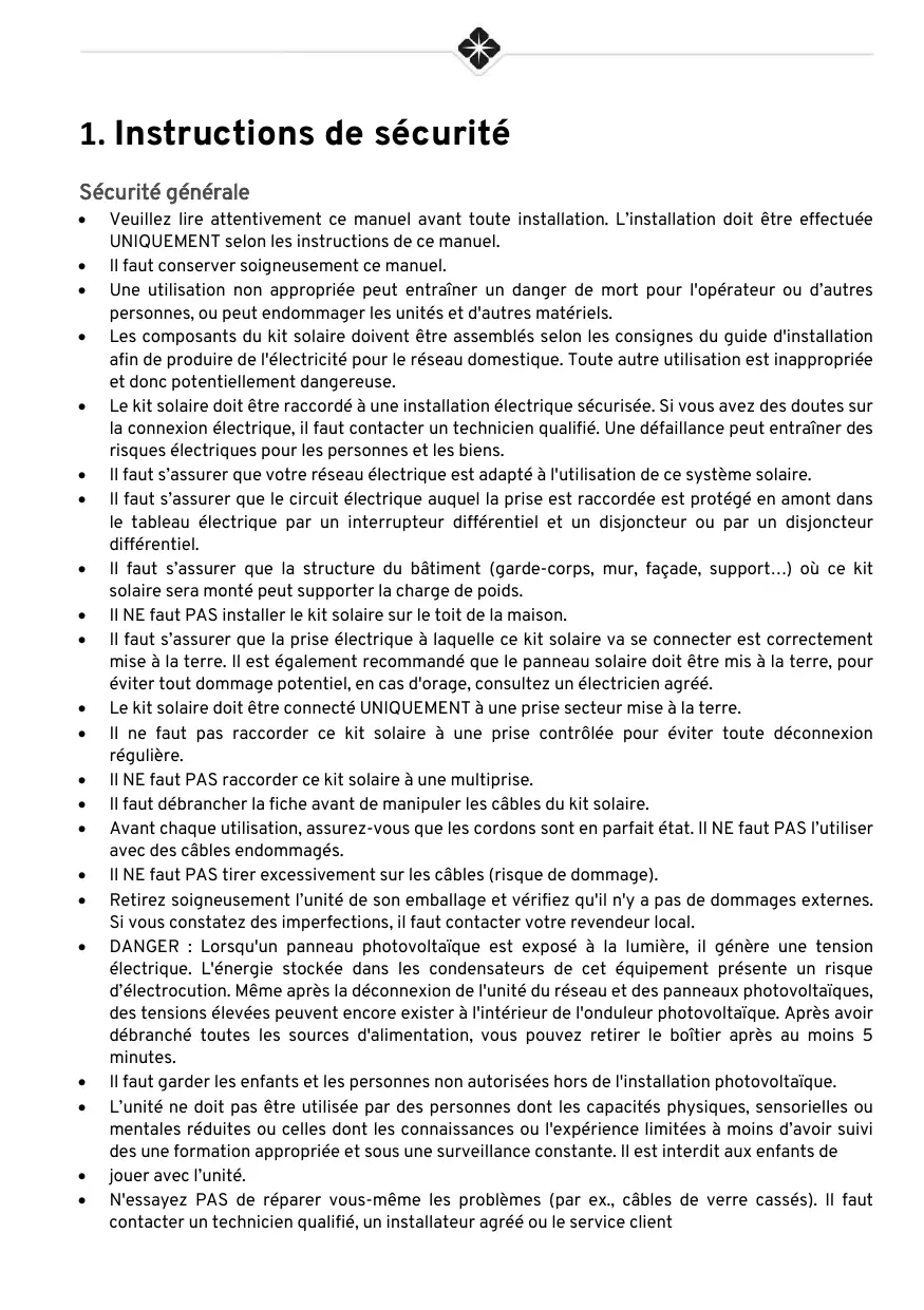 Sécurité générale + Veuillez lire attentivement ce manuel avant toute installation. L'installation doit être effectuée UNIQUEMENT selon les instructions de ce manuel. + Il faut conserver soigneusement ce manuel. + Une utilisation non appropriée peut entraîner un danger de mort pour l'opérateur ou d'autres personnes, ou peut endommager les unités et d'autres matériels. + Les composants du kit solaire doivent être assemblés selon les consignes du guide d'installation afin de produire de l'électricité pour le réseau domestique. Toute autre utilisation est inappropriée et donc potentiellement dangereuse. + Le kit solaire doit être raccordé à une installation électrique sécurisée. Si vous avez des doutes sur la connexion électrique, il faut contacter un technicien qualifié. Une défaillance peut entraîner des risques électriques pour les personnes et les biens. + Il faut s'assurer que votre réseau électrique est adapté à l'utilisation de ce système solaire. + Il faut s'assurer que le circuit électrique auquel la prise est raccordée est protégé en amont dans le tableau électrique par un interrupteur différentiel et un disjoncteur ou par un disjoncteur différentiel. + Il faut s'assurer que la structure du bâtiment (garde-corps, mur, façade, support...) où ce kit solaire sera monté peut supporter la charge de poids. + IINE faut PAS installer le kit solaire sur le toit de la maison. + Il faut s'assurer que la prise électrique à laquelle ce kit solaire va se connecter est correctement mise à la terre. Il est également recommandé que le panneau solaire doit être mis à la terre, pour éviter tout dommage potentiel, en cas d'orage, consultez un électricien agréé. + Le kit solaire doit être connecté UNIQUEMENT à une prise secteur mise à la terre. + llne faut pas raccorder ce kit solaire à une prise contrôlée pour éviter toute déconnexion régulière. + IINE faut PAS raccorder ce kit solaire à une multiprise. + Il faut débrancher la fiche avant de manipuler les câbles du kit solaire. + Avant chaque utilisation, assurez-vous que les cordons sont en parfait état. II NE faut PAS l'utiliser avec des câbles endommagés. + IINE faut PAS tirer excessivement sur les câbles (risque de dommage). + Retirez soigneusement l'unité de son emballage et vérifiez qu'il n'y a pas de dommages externes. Si vous constatez des imperfections, il faut contacter votre revendeur local. + DANGER : Lorsqu'un panneau photovoltaïque est exposé à la lumière, il génère une tension électrique. L'énergie stockée dans les condensateurs de cet équipement présente un risque d'électrocution. Même après la déconnexion de l'unité du réseau et des panneaux photovoltaïques, des tensions élevées peuvent encore exister à l'intérieur de l'onduleur photovoltaïque. Après avoir débranché toutes les sources d'alimentation, vous pouvez retirer le boîtier après au moins 5 minutes. + Il faut garder les enfants et les personnes non autorisées hors de l'installation photovoltaïque. + L'unité ne doit pas être utilisée par des personnes dont les capacités physiques, sensorielles ou mentales réduites ou celles dont les connaissances ou l'expérience limitées à moins d'avoir suivi des une formation appropriée et sous une surveillance constante. Il est interdit aux enfants de + _ jouer avec l'unité. + N'essayez PAS de réparer vous-même les problèmes (par ex, câbles de verre cassés). Il faut contacter un technicien qualifié, un installateur agréé ou le service client