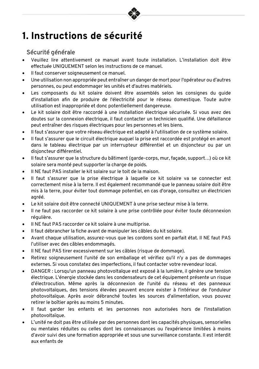 Sécurité générale + Veuillez lire attentivement ce manuel avant toute installation. L'installation doit être effectuée UNIQUEMENT selon les instructions de ce manuel. + _ ll faut conserver soigneusement ce manuel. + Uneutilisation non appropriée peut entraîner un danger de mort pour l'opérateur ou d'autres personnes, ou peut endommager les unités et d'autres matériels. + Les composants du kit solaire doivent être assemblés selon les consignes du quide d'installation afin de produire de l'électricité pour le réseau domestique. Toute autre utilisation est inapproprié et donc potentiellement dangereuse. + Le kit solaire doit être raccordé à une installation électrique sécurisée. Si vous avez des doutes sur la connexion électrique, il faut contacter un technicien qualifié. Une défaillance peut entraîner des risques électriques pour les personnes et les biens. + _ Il faut s'assurer que votre réseau électrique est adapté à l'utilisation de ce système solaire. + _ Il faut s'assurer que le circuit électrique auquel la prise est raccordée est protégé en amont dans le tableau électrique par un interrupteur différentiel et un disjoncteur ou par un disjoncteur différentiel. + Il faut s'assurer que la structure du bâtiment (garde-corps, mur, façade, support.) où ce kit solaire sera monté peut supporter la charge de poids. + _ILNE faut PAS installer le kit solaire sur le toit de la maison. + Il faut s'assurer que la prise électrique à laquelle ce kit solaire va se connecter est correctement mise à la terre. Il est également recommandé que le panneau solaire doit être mis à la terre, pour éviter tout dommage potentiel, en cas d'orage, consultez un électricien agré + Le kit solaire doit être connecté UNIQUEMENT à une prise secteur mise à la terre. + _ line faut pas raccorder ce kit solaire à une prise contrôlée pour éviter toute déconnexion régulière. + ILNE faut PAS raccorder ce kit solaire à une multiprise. + _ ll faut débrancher la fiche avant de manipuler les câbles du kit solaire. + Avant chaque utilisation, assurez-vous que les cordons sont en parfait état. Il NE faut PAS l'utiliser avec des câbles endommagés. + IINE faut PAS tirer excessivement sur les câbles (risque de dommage). + Retirez soigneusement l'unité de son emballage et vérifiez qu'il n'y à pas de dommages externes. Si vous constatez des imperfections, il faut contacter votre revendeur local. + DANGER : Lorsqu'un panneau photovoltaïque est exposé à la lumière, il génère une tension électrique. L'énergie stockée dans les condensateurs de cet équipement présente un risque d'électrocution. Même après la déconnexion de l'unité du réseau et des panneaux photovoltaïques, des tensions élevées peuvent encore exister à l'intérieur de l'onduleur photovoltaïque. Après avoir débranché toutes les sources d'alimentation, vous pouvez retirer le boîtier après au moins 5 minutes. + Il faut garder les enfants et les personnes non autorisées hors de l'installation photovoltaïque. + L'unité ne doit pas être utilisée par des personnes dont les capacités physiques, sensorielles où mentales réduites ou celles dont les connaissances ou l'expérience limitées à moins d'avoir suivi des une formation appropriée et sous une surveillance constante. Il est interdit aux enfants de