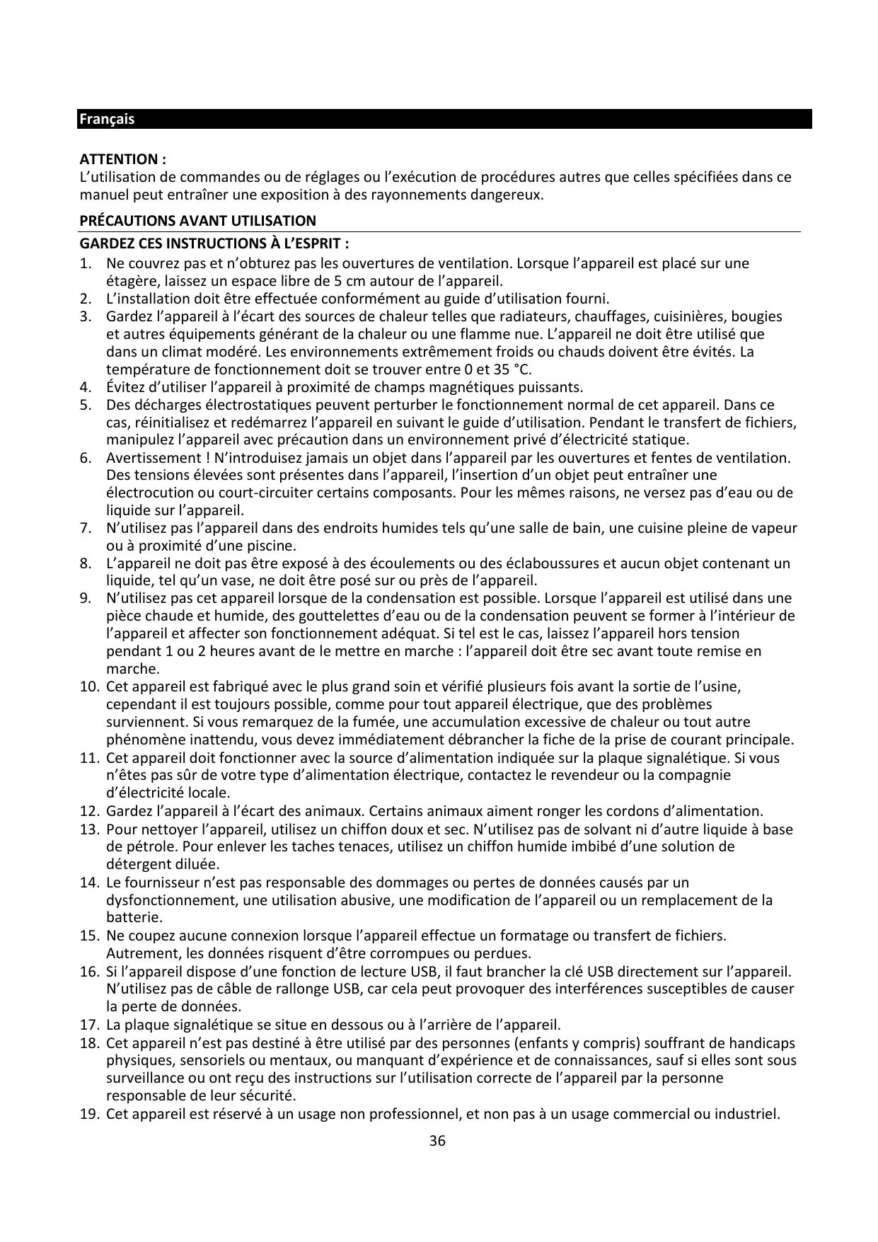 15. Ne coupez aucune connexion lorsque l'appareil effectue un formatage ou transfert de fichiers.