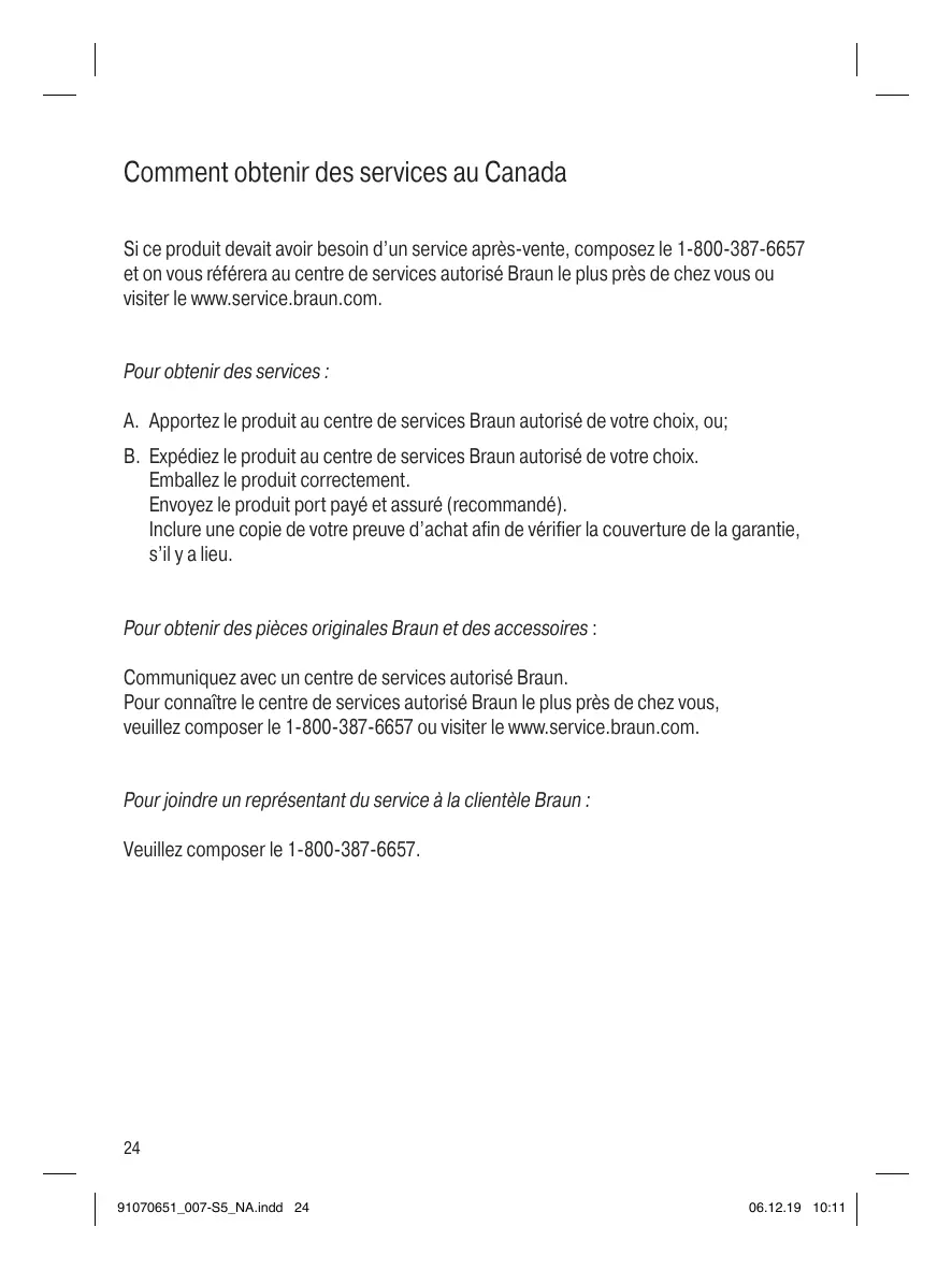 Si ce produit devait avoir besoin d’un service après-vente, composez le 1-800-387-6657 et on vous référera au centre de services autorisé Braun le plus près de chez vous ou visiter le www.service.braun.com.
