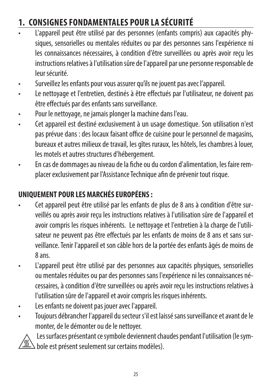 Cet appareil peut être utilisé par les enfants de plus de 8 ans à condition d'être sur- veillés ou après avoir reçu les instructions relatives à l'utilisation sûre de l'appareil et avoir compris les risques inhérents. Le nettoyage et l'entretien à la charge de l'utili- sateur ne peuvent pas être effectués par les enfants de moins de 8 ans et sans sur- veillance. Tenir l'appareil et son cäble hors de la portée des enfants âgés de moins de 8ans.
