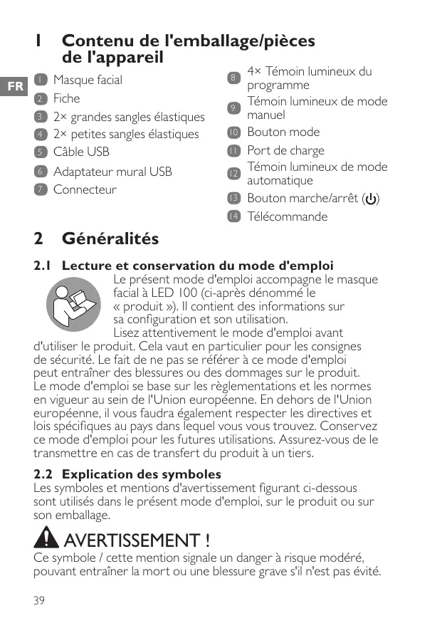 Vérification de l'appareil et du contenu de l'emballage 45 Recharge 46 Assemblage 47 Fonctionnement 47 Effectuer la séance 47 « produit »). Il contient des informations sur sa configuration et son utilisation.