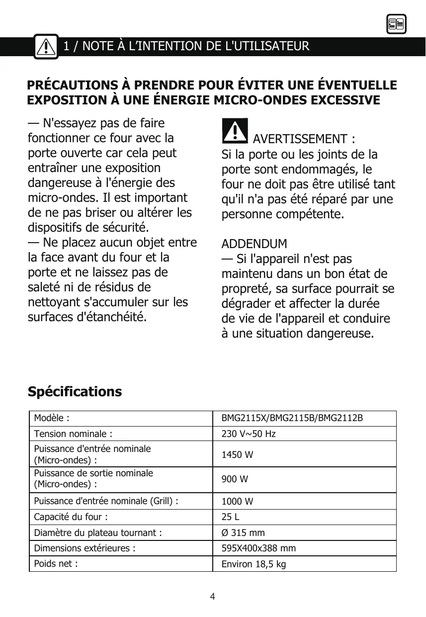 FN AVERTISSEMENT : Les liquides et autres aliments ne doivent pas être chauffés dans des récipients hermétiques car ils sont susceptibles d'exploser.