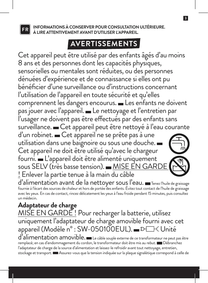 — L'appareil et l'adaptateur de charge ne doivent être réutilisés qu'après séchage complet