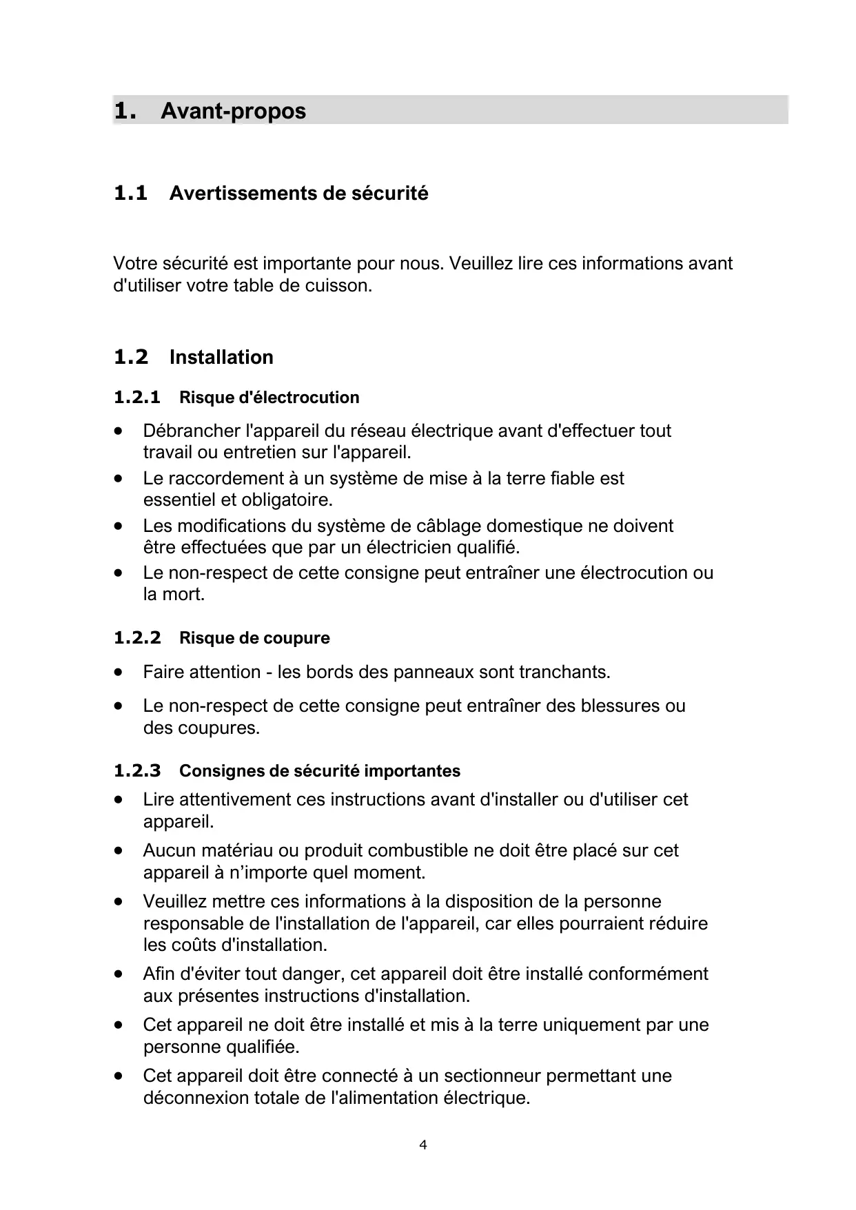 1.3.2 Risque pour la santé … 1.3.3 Risque lié aux surfaces chaudes. 1.3.4 Risque de coupure 1.3.5 Consignes de sécurité importantes Vue de dessus Panneau de commande Principes de fonctionnement . Avant d'utiliser votre nouvelle Table de cuisson à induction Spécifications techniques