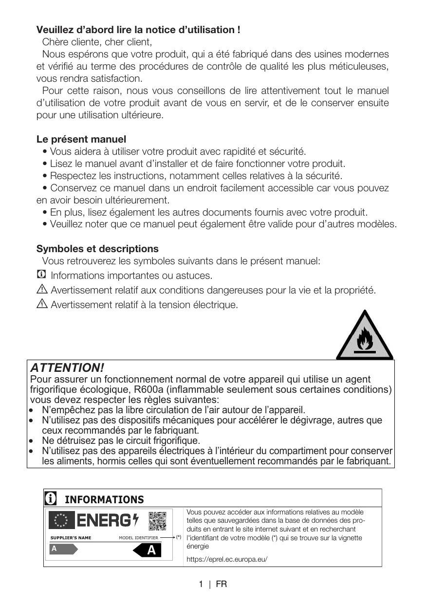 L'étiquette avec les caractéristiques techniques est située sur le mur gauche à l'intérieur du réfrigérateur. Ne branchez jamais votre réfrigérateur à des systèmes d'économie d'énergie, cela peut l'endommager. S'il y a une lumière bleue sur le réfrigérateur, ne la regardez pas avec des outils optiques.