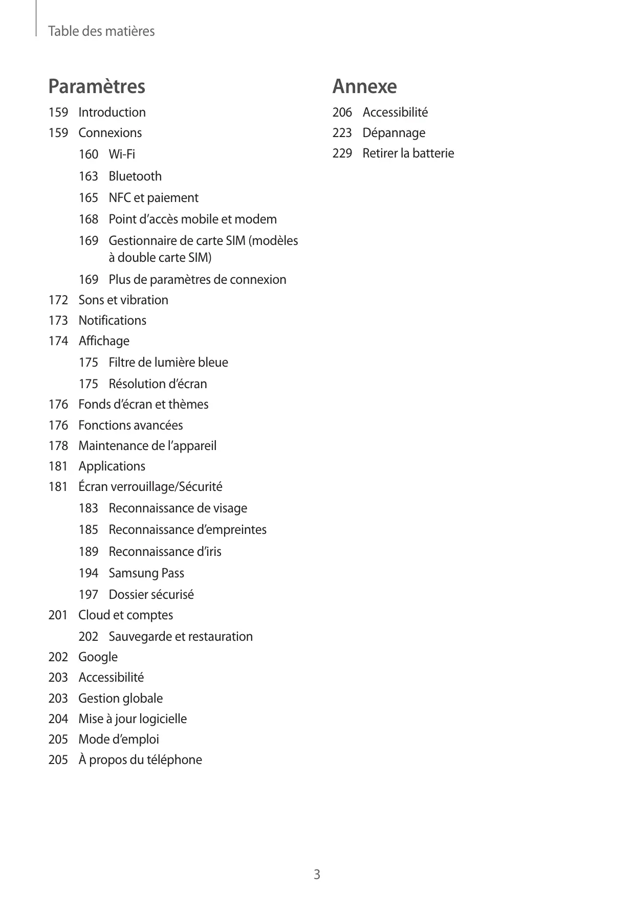 Messages Internet Email Appareil photo Galerie Always On Display Écran latéral Multi-fenêtres Samsung Gear Samsung Members Samsung Notes Calendrier Samsung Health Enregistreur vocal Mes fichiers Horloge Calculatrice Game Launcher Samsung Connect Partager du contenu Samsung DeX Se raccorder à un écran externe Applications Google Table des matières Paramètres Annexe 159 Introduction 159 Connexions 206 Accessibilité 223 Dépannage 229 Retirer la batterie 160 Wi-Fi 163 Bluetooth 165 NFC et paiement 168 Point d’accès mobile et modem 169 Gestionnaire de carte SIM (modèles à double carte SIM) 169 Plus de paramètres de connexion 172 Sons et vibration 173 Notifications 174 Affichage 175 Filtre de lumière bleue