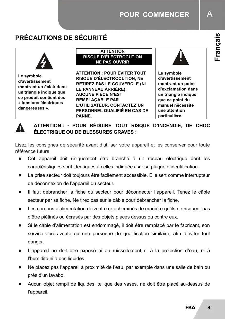Le symbole ATTENTION : POUR ÉVITER TOUT | Le symbole sy RISQUE D'ÉLECTROCUTION, NE d'avertissement d'avertissement RETIREZ PAS LE COUVERCLE (NI montrant un point montrant un éclair dans | LE PANNEAU ARRIÈRE). d'exclamation dans un triangle indique que | AUCUNE PIÈCE N’EST un triangle indique ce produit un nt des | REMPLAÇABLE PAR que ce point du ensons electriques L'UTILISATEUR. CONTACTEZ UN manuel nécessite u > PERSONNEL QUALIFIÉ EN CAS DE | une attention PANNE. particulière. ATTENTION : - POUR RÉDUIRE TOUT RISQUE D'INCENDIE, DE CHOC ÉLECTRIQUE OÙ DE BLESSURES GRAVES : Lisez les consignes de sécurité avant d'utiliser votre appareil et les conserver pour toute référence future. e Cet appareil doit uniquement être branché à un réseau électrique dont les caractéristiques sont identiques à celles indiquées sur sa plaque d'identification. e La prise secteur doit toujours être facilement accessible. Elle sert comme interrupteur de déconnexion de l'appareil du secteur. e Il faut débrancher la fiche du secteur pour déconnecter l'appareil. Tenez le câble secteur par sa fiche. Ne tirez pas sur le câble pour débrancher la fiche. e _Les cordons d'alimentation doivent être acheminés de manière qu'ils ne risquent pas d'être piétinés ou écrasés par des objets placés dessus ou contre eux. e Sile câble d'alimentation est endommagé, il doit être remplacé par le fabricant, son service après-vente où une personne de qualification similaire, afin d'éviter tout danger. e L'appareil ne doit être exposé ni au ruissellement ni à la projection d'eau, ni à l'humidité ni à des liquides. e Ne placez pas l'appareil à proximité de l’eau, par exemple dans une salle de bain ou près d'un lavabo. e Aucun objet rempli de liquides, tel que des vases, ne doit être placé au-dessus de l'appareil. FRA 3