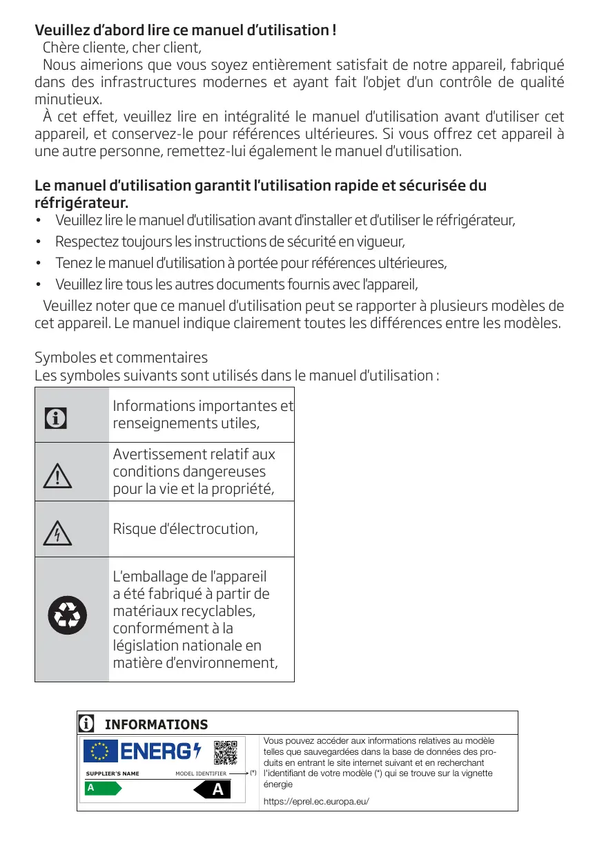 Le manuel d'utilisation garantit l'utilisation rapide et sécurisée du réfrigérateur. + Veuillezlire le manuel d'utilisation avant d'installer et d'utiliser le réfrigérateur,