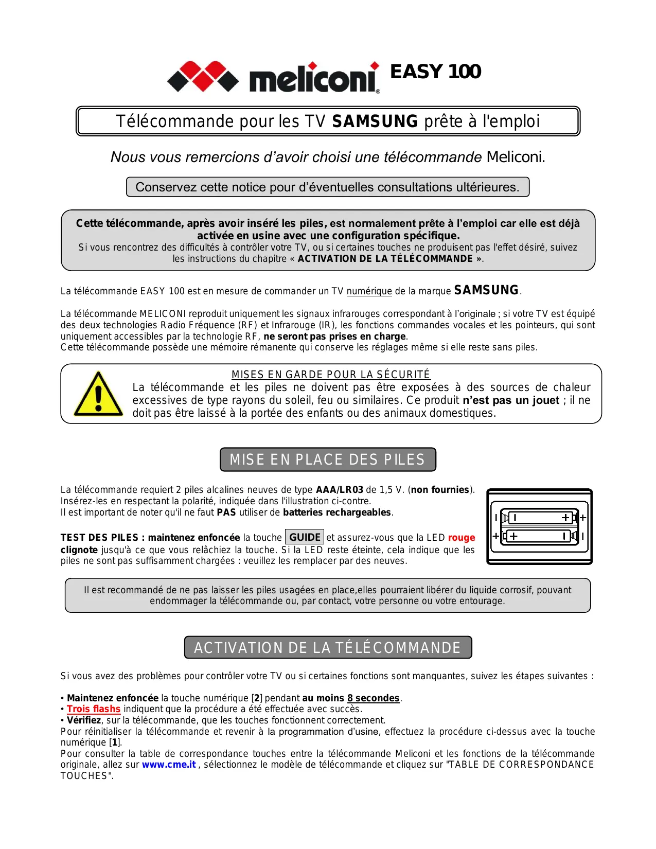 EASY 100 - Télécommande MELICONI - Notice d'utilisation et mode d'emploi gratuit