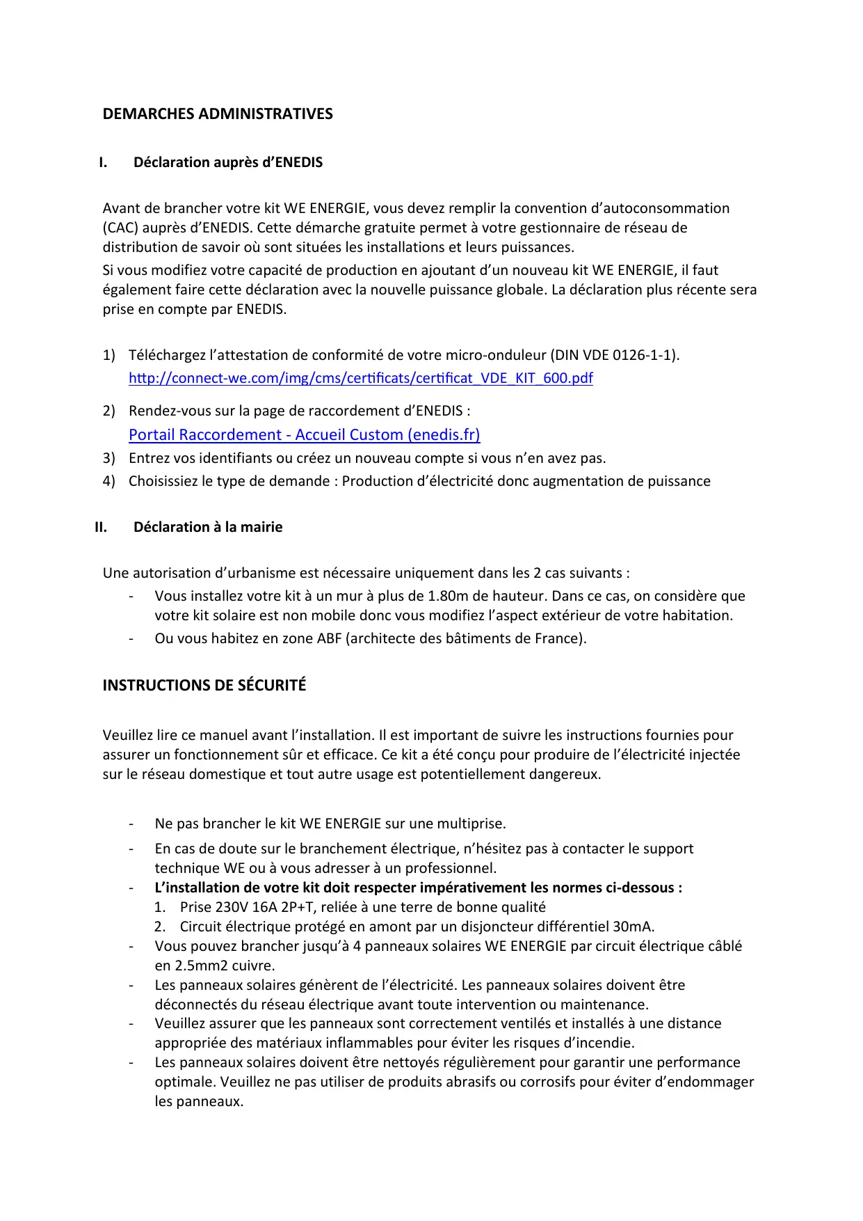 Avant de brancher votre kit WE ENERGIE, vous devez remplir la convention d’autoconsommation (CAC) auprès d’ENEDIS. Cette démarche gratuite permet à votre gestionnaire de réseau de distribution de savoir où sont situées les installations et leurs puissances. Si vous modifiez votre capacité de production en ajoutant d’un nouveau kit WE ENERGIE, il faut également faire cette déclaration avec la nouvelle puissance globale. La déclaration plus récente sera prise en compte par ENEDIS.
