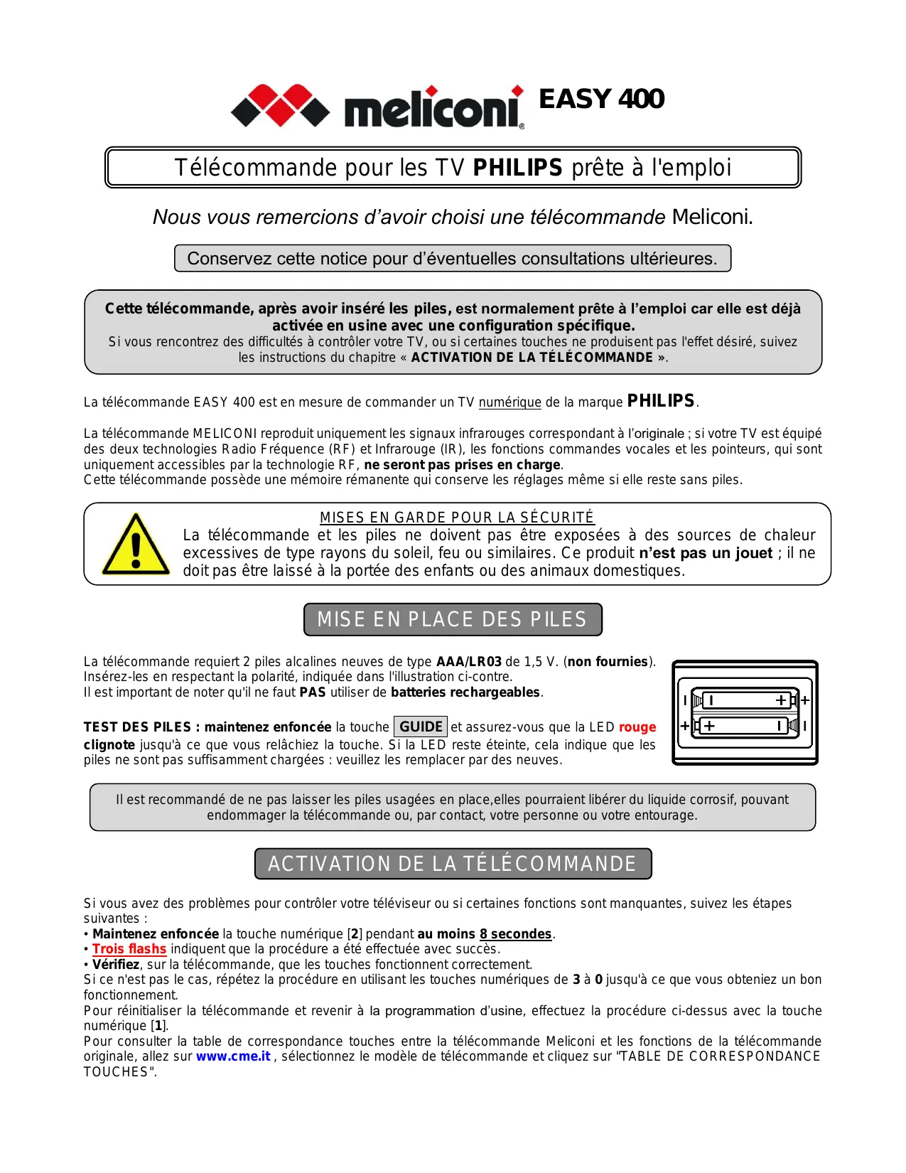 EASY 400 - Télécommande MELICONI - Notice d'utilisation et mode d'emploi gratuit