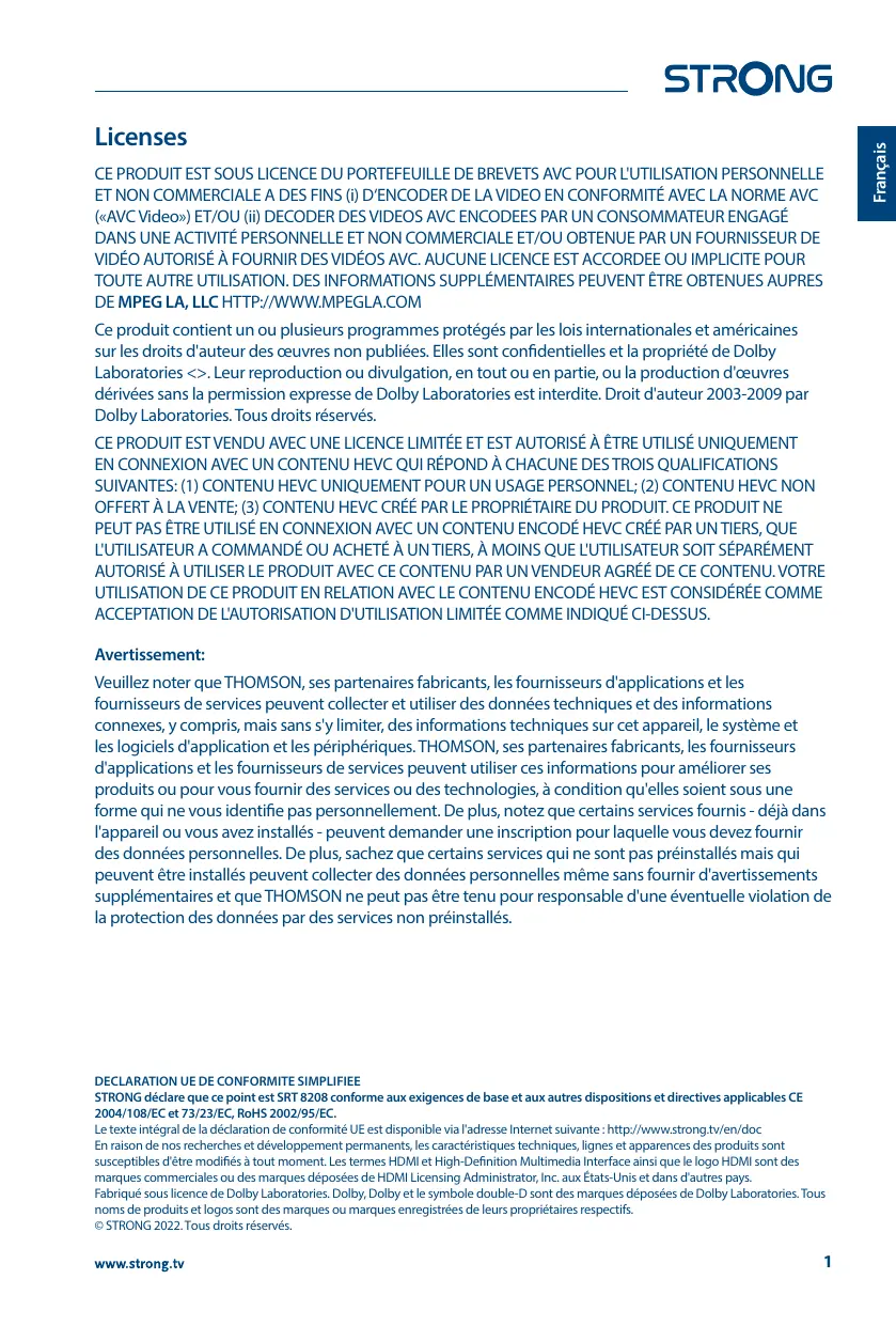 STRONG déclare que ce point est SRT 8208 conforme aux exigences de base etaux autres dispositions et directives applicables CE 2004/108/EC et 73/23/EC, RoHS 2002/95/EC. Letexte intégral de la déclaration de conformité UE est disponible via l'adresse Internet suivante :ttpy/unmstrongv/en/doc En raison de nos recherches et développement permanents les caractéristiques techniques ignes et apparences des produits sont susceptibles d'être modifiés à tout moment. Les termes HDMI et High-Defnition Multimedia Interface ainsi que le logo HDMI sont des marques commerciales ou des marques déposées de HDMI Licensing Administrator Inc.aux États Unis et dans d'autres pays Fabriqué sous licence de Dolby Laboratories Dolby, Dolby etle symbole double-D sont des marques déposées de Dolby Lborataries. Tous noms de produits et logos sont des marques ou marques enregistrées de leurs propriétaires respectifs © STRONG 2022. Tous droits réservés, wustrongiv 1 Français