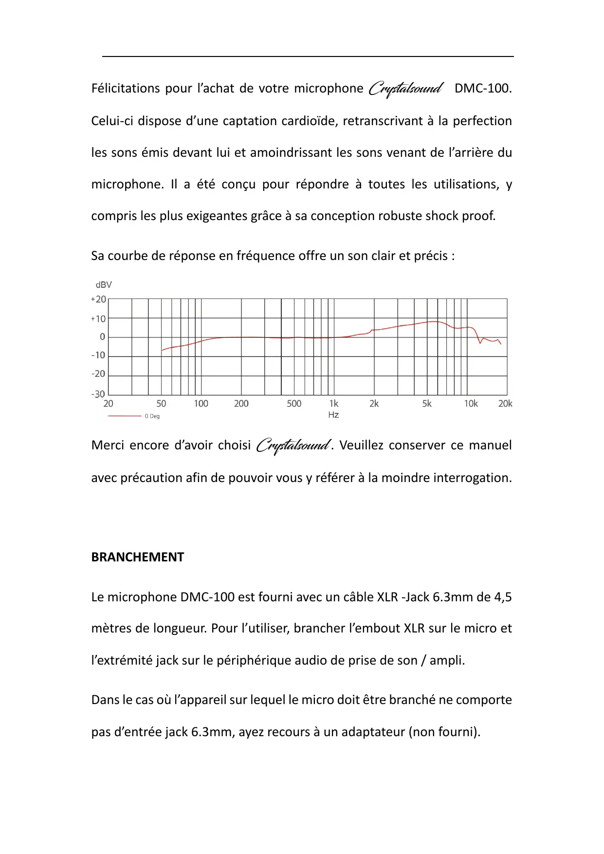 Félicitations pour l'achat de votre microphone Crystallsound DMC-100. Celui-ci dispose d'une captation cardioïde, retranscrivant à la perfection lessonsémis devant lui et amoindrissant lessons venant de l'arrête du microphone. Il a été créé pour répondre à toutes les utilisations, y compris les plus exigeantes grâce à sa conception robuste shock proof.