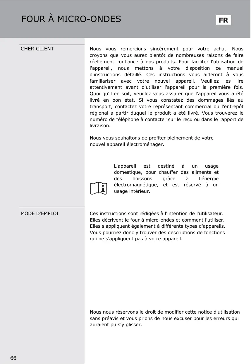 Ces instructions sont rédigées à l'intention de l'utilisateur. Elles décrivent le four à micro-ondes et comment l'utiliser. Elles s'appliquent également à différents types d'appareils. Vous pourriez donc y trouver des descriptions de fonctions qui ne s'appliquent pas à votre appareil.