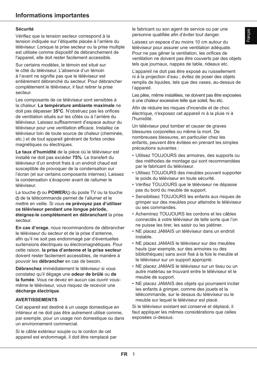 Informations importantes Sécurité Vérifiez que la tension secteur correspond à la tension indiquée sur l'étiquette placée à l'arrière du téléviseur. Lorsque la prise secteur ou la prise multiple est utilisée comme dispositif de débranchement de l'appareil, elle doit rester facilement accessible. Sur certains modèles, le témoin est situé sur le côté du téléviseur. L'absence d'un témoin à l'avant ne signifie pas que le téléviseur est entièrement débranché du secteur. Pour débrancher complètement le téléviseur, il faut retirer la prise secteur. Les composants de ce téléviseur sont sensibles à la chaleur. La température ambiante maximale ne doit pas dépasser 35°C. N'obstruez pas les orifices de ventilation situés sur les côtés ou à l'arrière du téléviseur. Laissez suffisamment d'espace autour du téléviseur pour une ventilation efficace. Installez ce téléviseur loin de toute source de chaleur (cheminée, etc.) et de tout appareil générant de fortes ondes magnétiques ou électriques. Le taux d'humidité de la pièce où le téléviseur est installé ne doit pas excéder 75%. Le transfert du téléviseur d'un endroit frais à un endroit chaud est susceptible de provoquer de la condensation sur l'écran (et sur certains composants internes). Laissez la condensation s'évaporer avant de rallumer le téléviseur. La touche & où POWER{ du poste TV ou la touche & de la télécommande permet de l'allumer et le mettre en veille. Si vous ne prévoyez pas d'utiliser ce téléviseur pendant une longue période, éteignez-le complètement en débranchant la prise secteur. En cas d'orage, nous recommandons de débrancher le téléviseur du secteur et de la prise d'antenne, afin qu'il ne soit pas endommagé par d'éventuelles surtensions électriques ou électromagnétiques. Pour cette raison, la prise d'antenne et la prise secteur doivent rester facilement accessibles, de manière à pouvoir les débrancher en cas de besoin. Débranchez immédiatement le téléviseur si vous constatez qu'il dégage une odeur de brälé ou de la fumée. Vous ne devez en aucun cas ouvrir vous- même le téléviseur, vous risquez de recevoir une décharge électrique. AVERTISSEMENTS Cet appareil est destiné à un usage domestique en intérieur et ne doit pas être autrement utilisé comme, par exemple, pour un usage non domestique ou dans. un environnement commercial. Si le câble extérieur souple ou le cordon de cet appareil est endommagé, il doit être remplacé par le fabricant ou son agent de service ou par une personne qualifiée afin d'éviter tout danger. Laissez un espace d'au moins 10 em autour du téléviseur pour assurer une ventilation adéquate. Pour ne pas gêner la ventilation, les orifices de ventilation ne doivent pas être couverts par des objets tels que journaux, nappes de table, rideaux etc. L'appareil ne doit pas être exposé au ruissellement ni à la projection d'eau ; évitez de poser des objets remplis de liquides, tels que des vases, au-dessus de l'appareil Les piles, même installées, ne doivent pas être exposées à une chaleur excessive telle que soleil, eu etc. Afin de réduire les risques d'incendie et de choc électrique, n'exposez cet appareil ni à la pluie ni à l'humidité. Un téléviseur peut tomber et causer de graves blessures corporelles ou même la mort. De nombreuses blessures, en particulier chez les enfants, peuvent être évitées en prenant les simples précautions suivantes + Utilisez TOUJOURS des armoires, des supports ou des méthodes de montage qui sont recommandées par le fabricant du téléviseur. + Utilisez TOUJOURS des meubles pouvant supporter le poids du téléviseur en toute sécurité. Vérifiez TOUJOURS que le téléviseur ne dépasse pas du bord du meuble de support. + Sensibilisez TOUJOURS les enfants aux risques de grimper sur des meubles pour atteindre le téléviseur ou ses commandes. + Acheminez TOUJOURS les cordons et les câbles connectés à votre téléviseur de telle sorte que l'on ne puisse les tirer, les saisir ou les piétiner. NE placez JAMAIS un téléviseur dans un endroit instable. + NE placez JAMAIS le téléviseur sur des meubles hauts (par exemple, sur des armoires ou des bibliothèques) sans avoir fixé à la fois le meuble et le téléviseur sur un support approprié. + NE placez JAMAIS le téléviseur sur un tissu ou un autre matériau se trouvant entre le téléviseur et le meuble de support. NE placez JAMAIS des objets qui pourraient inciter les enfants à grimper, comme des jouets et la télécommande, sur le dessus du téléviseur ou le meuble sur lequel le téléviseur est placé. Si le téléviseur existant est conservé et déplacé, il faut appliquer les mêmes considérations que celles exposées ci-dessus.