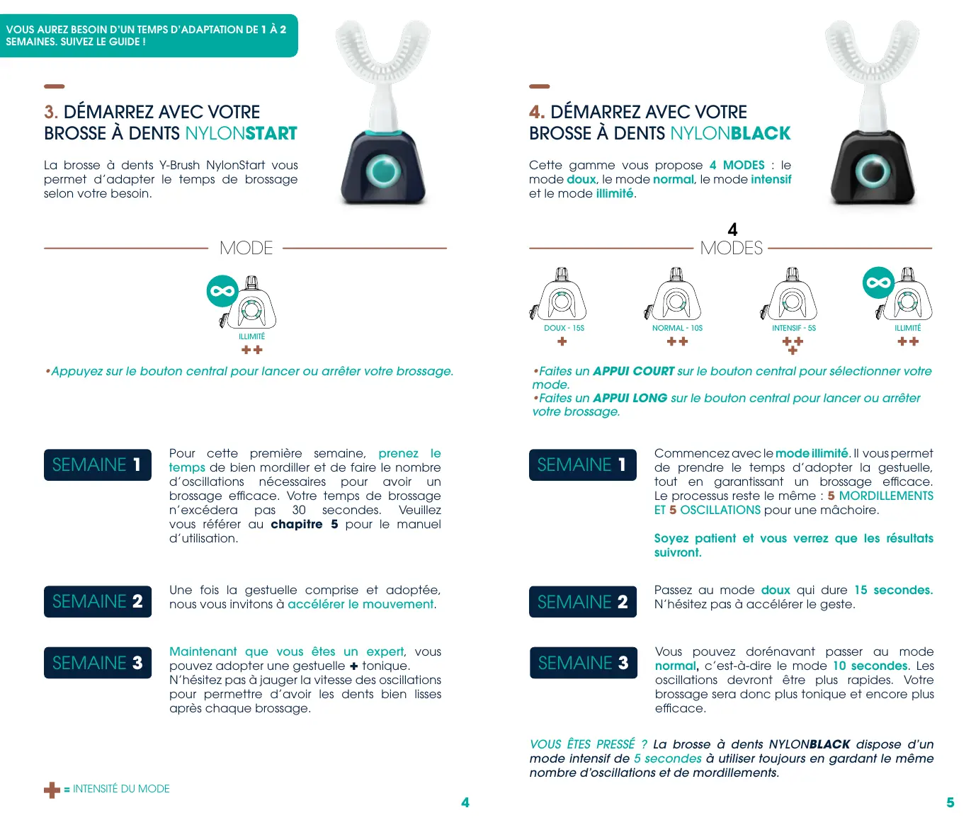 VOUS ÊTES PRESSÉ ? La brosse à dents NYLONBLACK dispose d'un mode intensif de 5 secondes à utiliser toujours en gardant le même nombre d'oscillations et de mordillements.