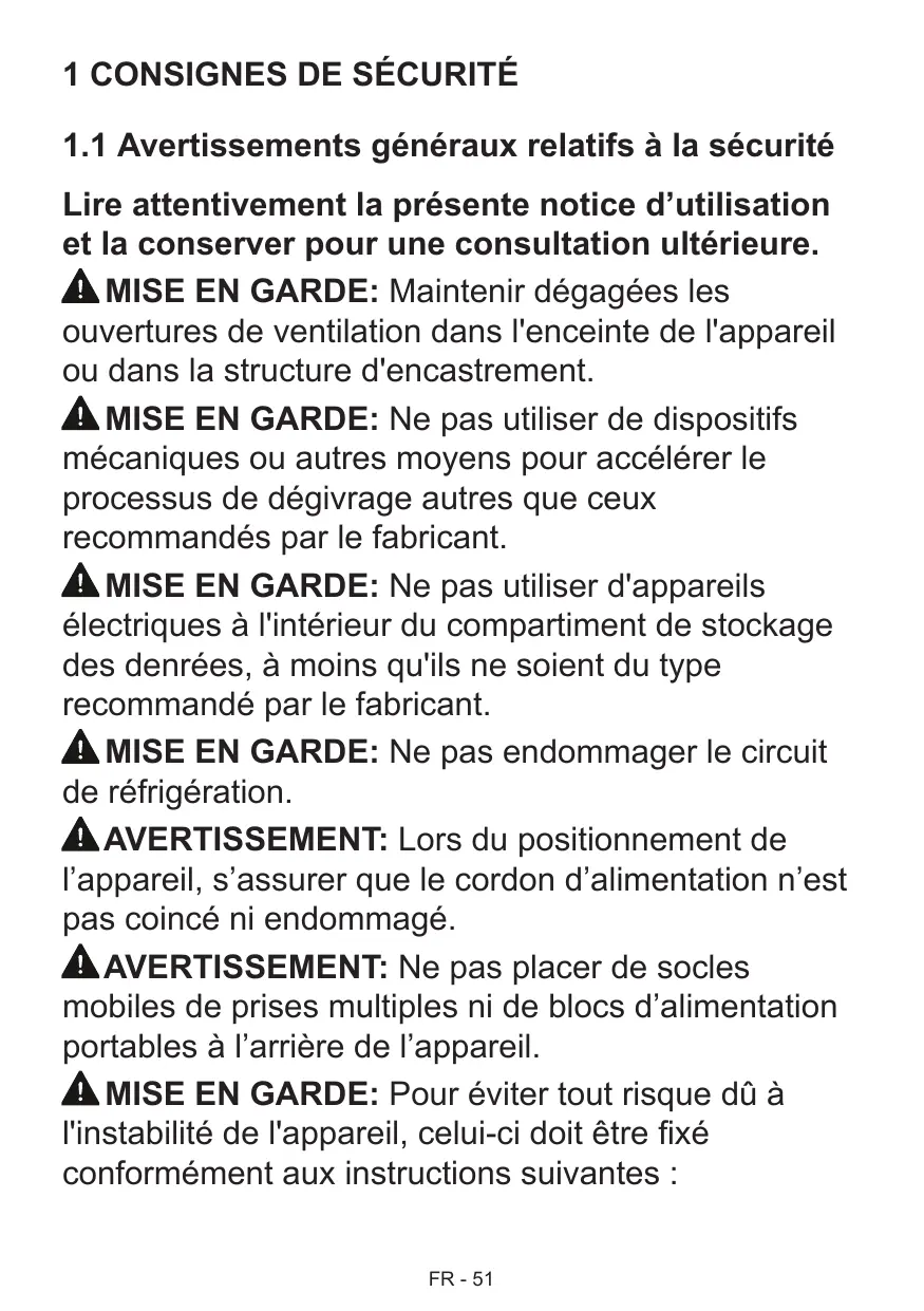 MISE EN GARDE: Ne pas utiliser de dispositifs mécaniques ou autres moyens pour accélérer le processus de dégivrage autres que ceux recommandés par le fabricant.