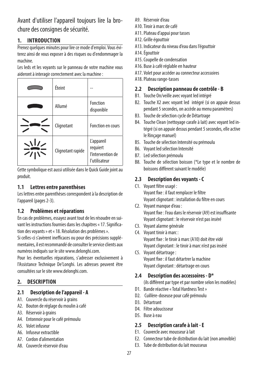 2.3 Description des voyants -C C1. Voyant filtre usagé : Voyant fie : il faut remplacer le filtre Voyant dignotant : installation du filtre en cours €. Voyant manque d'eau : Voyant fixe : l'eau dans le réservoir (A9) est insuffisante Voyant dignotant : le réservoir n'est pas inséré G.. Voyant alarme générale C4. Voyant tiroir à marc: Voyant fixe : le tiroir à marc (A10) doit être vidé Voyant dignotant : le tiroir à marc n'est pas inséré C5. Voyant détartrage : Voyant fixe : il faut détartrer la machine Voyant dignotant : détartrage en cours
