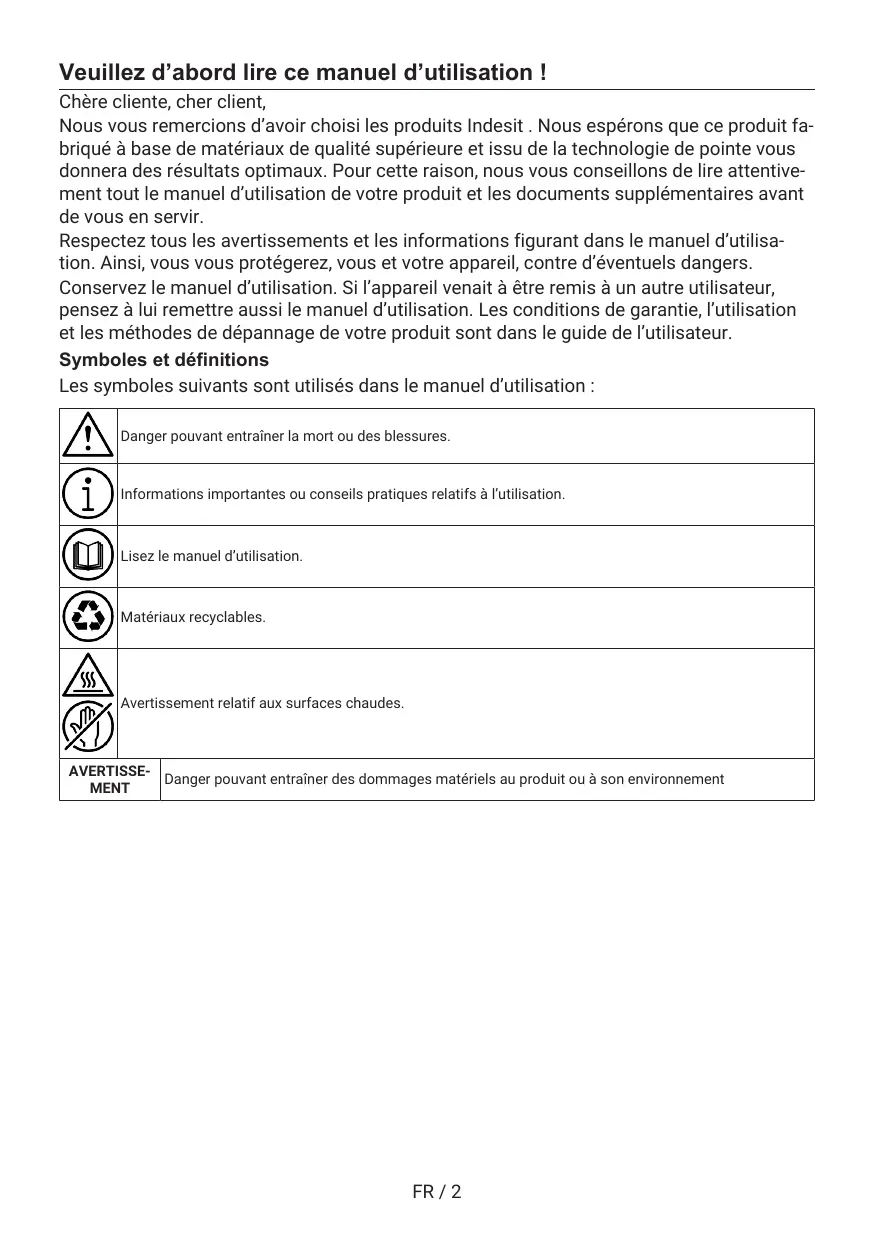 Veuillez d’abord lire ce manuel d'utilisation ! Chère cliente, cher client, Nous vous remercions d'avoir choisi les produits Indesit . Nous espérons que ce produit fa- briqué à base de matériaux de qualité supérieure et issu de la technologie de pointe vous donnera des résultats optimaux. Pour cette raison, nous vous conseillons de lire attentive- ment tout le manuel d'utilisation de votre produit et les documents supplémentaires avant de vous en servir. Respectez tous les avertissements et les informations figurant dans le manuel d'utilisa- tion. Ainsi, vous vous protégerez, vous et votre appareil, contre d'éventuels dangers. Conservez le manuel d'utilisation. Si l'appareil venait à être remis à un autre utilisateur, pensez à lui remettre aussi le manuel d'utilisation. Les conditions de garantie, l’utilisation et les méthodes de dépannage de votre produit sont dans le guide de l'utilisateur. Symboles et définitions Les symboles suivants sont utilisés dans le manuel d'utilisation : Danger pouvant entraîner la mort ou des blessures Informations importantes ou conseils pratiques relatifs à l'utilisation. Lisez le manuel d'utilisation: Matériaux recyclables. Avertissement relatif aux surfaces chaudes. SOPOE AVERTISSE- MENT — [Danger pouvant entraîner des dommages matériels au produit ou à son environnement FR/2