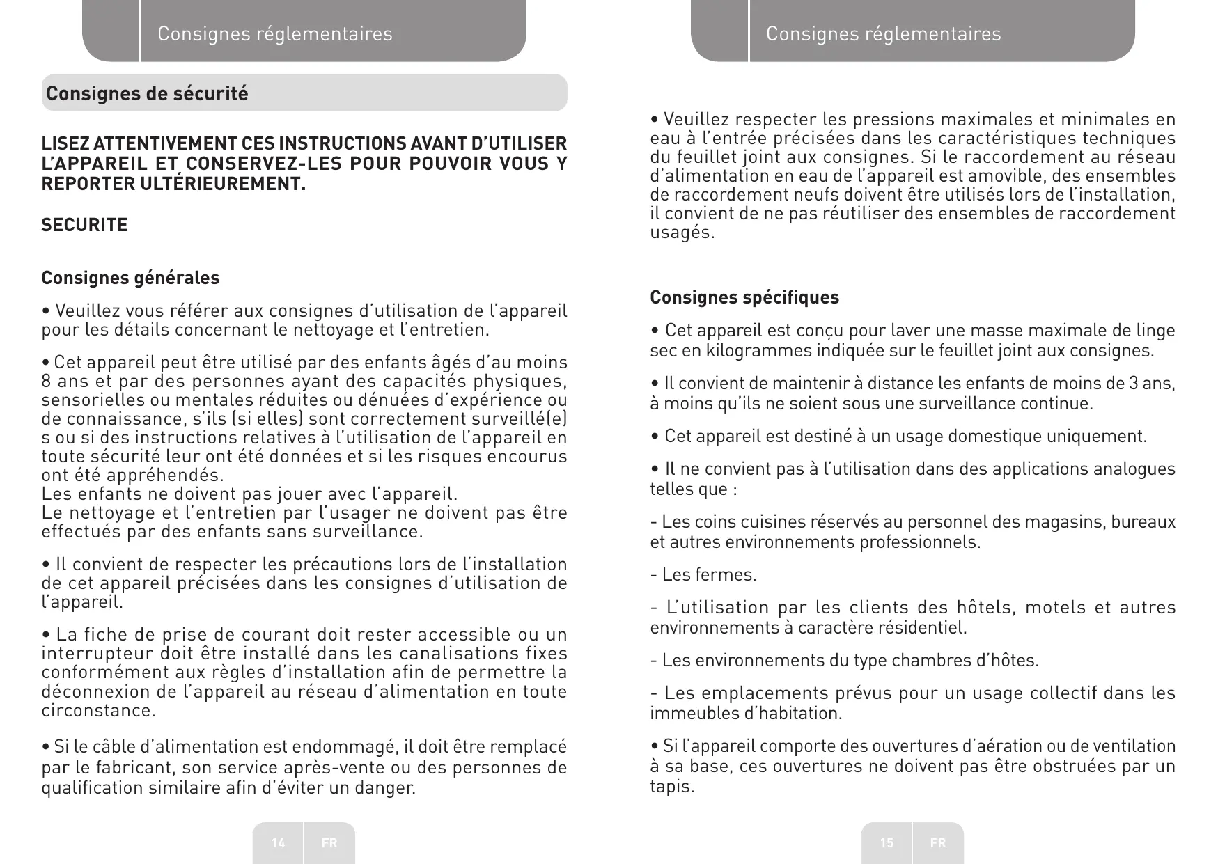 L'APPAREIL ET CONSERVEZ-LES POUR POUVOIR VOUS Y REPORTER ULTÉRIEUREMENT. SECURITE Consignes générales e Veuillez vous référer aux consignes d'utilisation de l'appareil pour les détails concernant le nettoyage et l'entretien. e Cet appareil peut être utilisé par des enfants âgés d'au moins 8 ans et par des personnes ayant des capacités physiques, sensorielles ou mentales réduites ou dénuées d'expérience ou de connaissance, s'ils (si elles] sont correctement surveillé(e) s où si des instructions relatives à l'utilisation de l'appareil en toute sécurité leur ont été données et si Les risques encourus ont été appréhendés. Les enfants ne doivent pas jouer avec l'appareil. Le nettoyage et l'entretien par l'usager ne doivent pas être effectués par des enfants sans surveillance. IL convient de respecter Les précautions Lors de l'installation de cet appareil précisées dans Les consignes d'utilisation de l'appareil. + La fiche de prise de courant doit rester accessible ou un interrupteur doit être installé dans les canalisations fixes conformément aux règles d'installation afin de permettre la déconnexion de l'appareil au réseau d'alimentation en toute circonstance. e Sile câble d'alimentation est endommagé, il doit être remplacé par Le fabricant, son service après-vente ou des personnes de qualification similaire afin d'éviter un danger. LL. Consignes réglementaires + Veuillez respecter les pressions maximales et minimales en eau à l'entrée précisées dans les caractéristiques techniques du feuillet joint aux consignes. Si Le raccordement au réseau d'alimentation en eau de l'appareil est amovible, des ensembles de raccordement neufs doivent être utilisés lors de l'installation, il convient de ne pas réutiliser des ensembles de raccordement usagés. Consignes spécifiques e Cet appareil est concu pour laver une masse maximale de linge sec en kilogrammes indiquée sur Le feuillet joint aux consignes. e ILconvient de maintenir à distance les enfants de moins de 3 ans, à moins qu'ils ne soient sous une surveillance continue. e Cet appareil est destiné à un usage domestique uniquement. e ILne convient pas à l'utilisation dans des applications analogues telles que : - Les coins cuisines réservés au personnel des magasins, bureaux et autres environnements professionnels. - Les fermes. - L'utilisation par les clients des hôtels, motels et autres environnements à caractère résidentiel. - Les environnements du type chambres d'hôtes. - Les emplacements prévus pour un usage collectif dans Les immeubles d'habitation. e Si l'appareil comporte des ouvertures d'aération où de ventilation à sa base, ces ouvertures ne doivent pas être obstruées par un tapis.