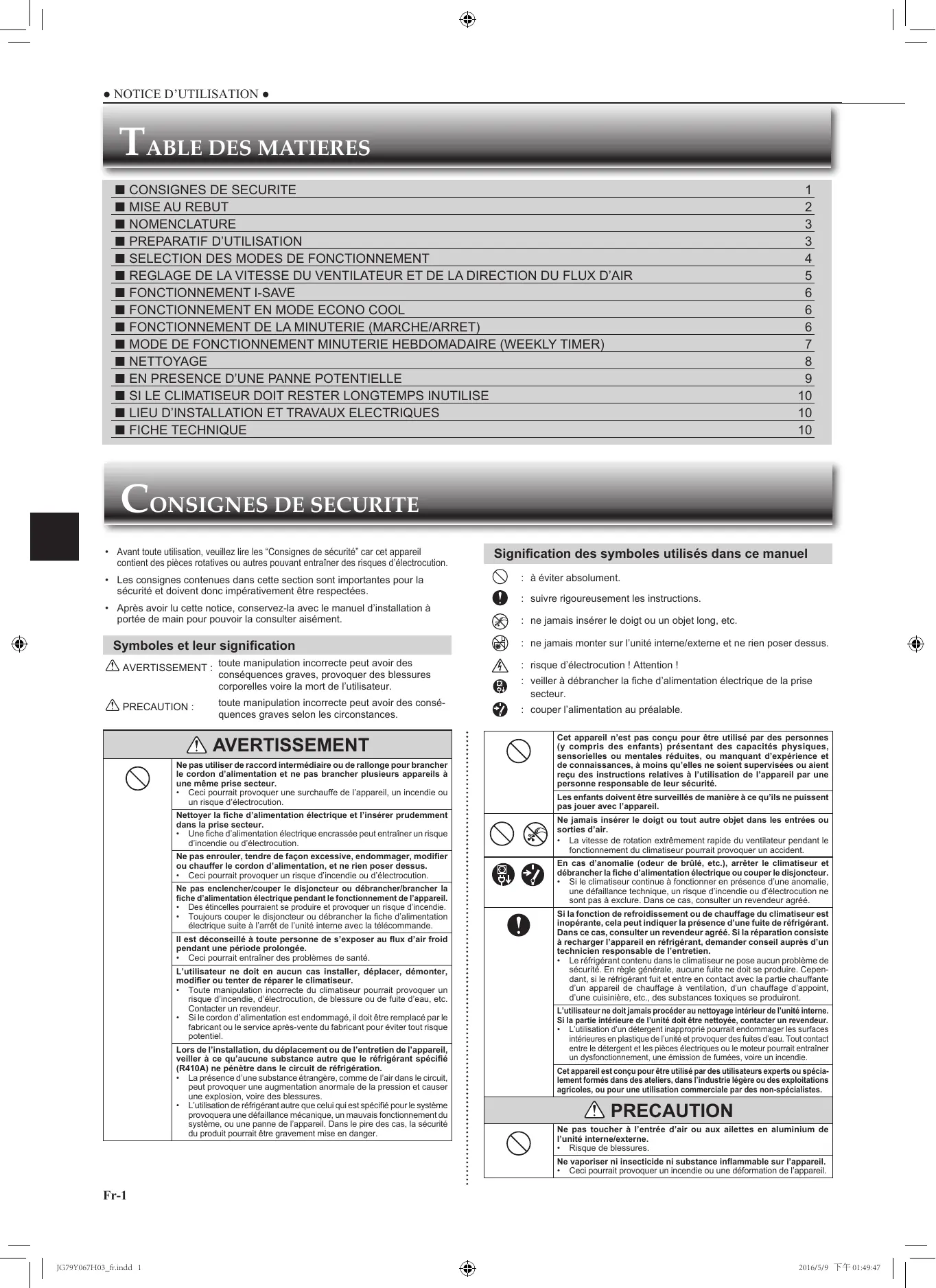 + Toute manipulation incorrecte du climatiseur pourrait provequer un risque d'incendie, d'électrocution, de blessure ou de fuite d'eau, etc.