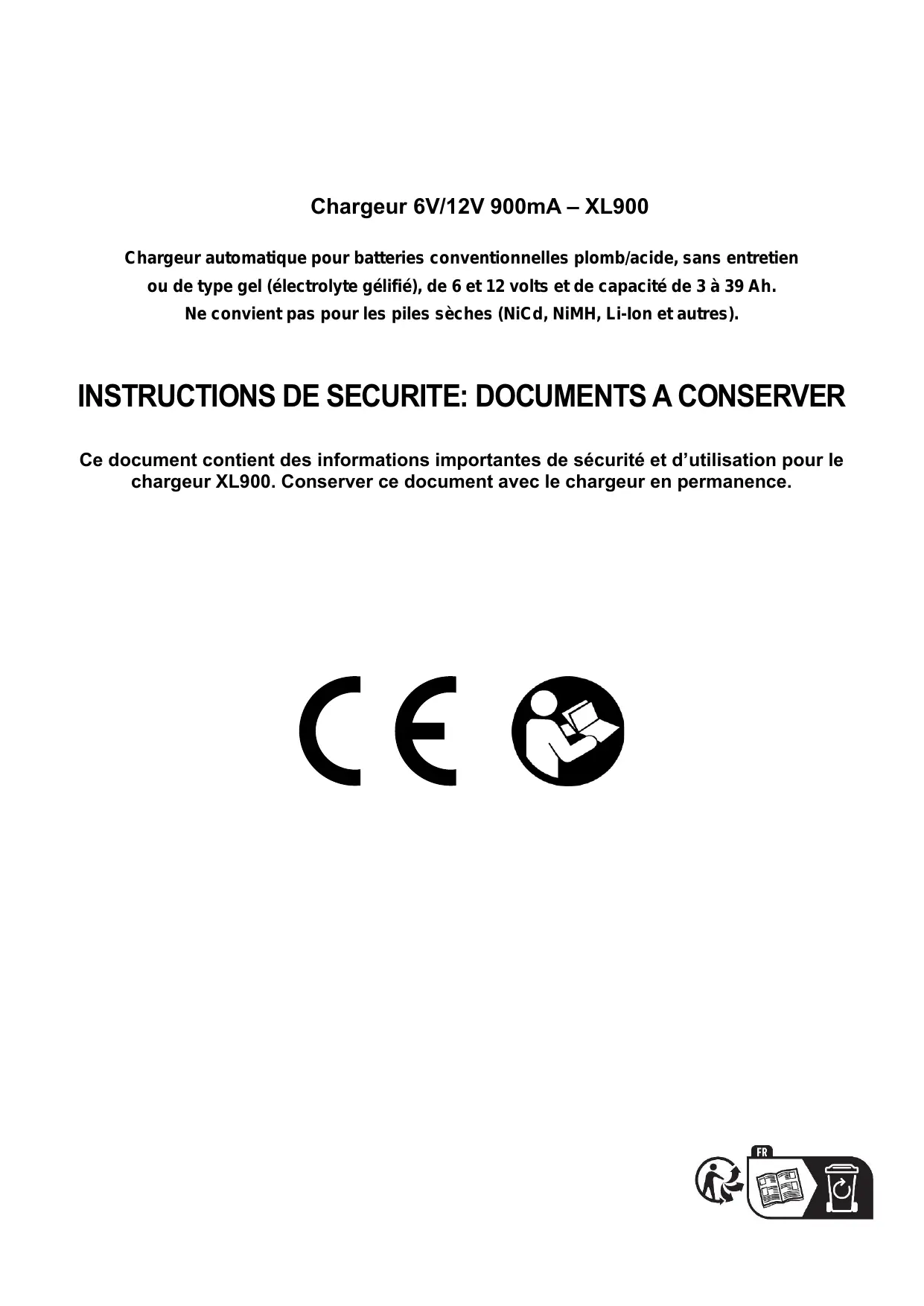 Ce document contient des informations importantes de sécurité et d’utilisation pour le chargeur XL900. Conserver ce document avec le chargeur en permanence.
