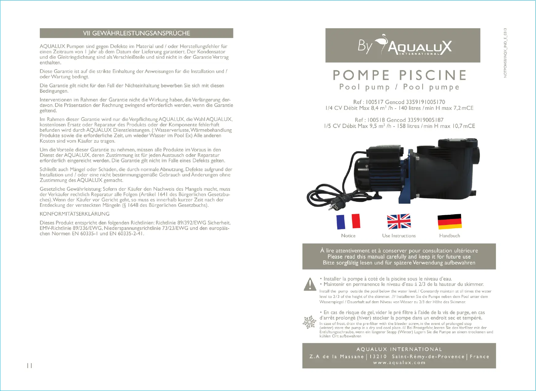 100517, 100518 - Pompe de piscine AQUALUX - Notice d'utilisation et mode d'emploi gratuit