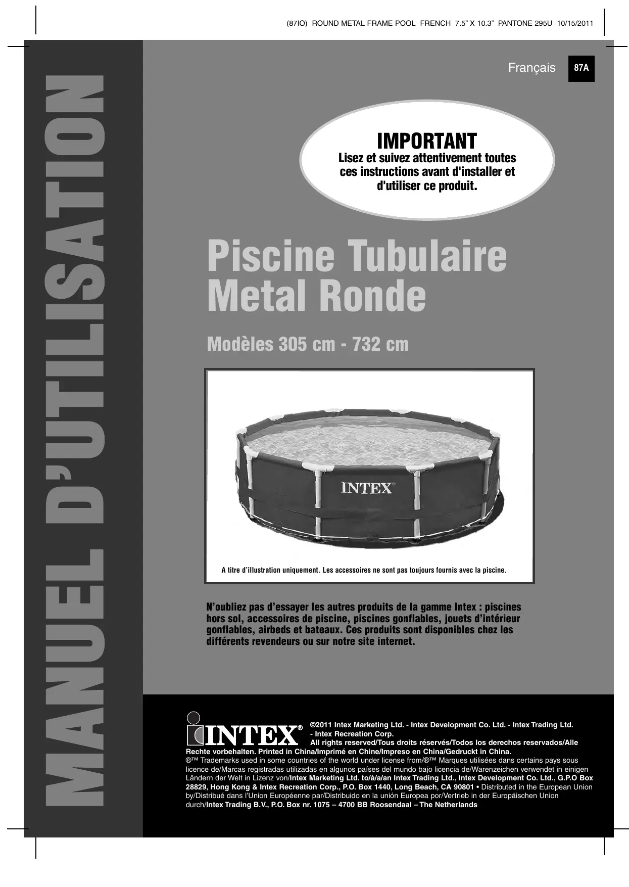 (8710) ROUND METAL FRAME POOL FRENCH 7.5 X 10.3" PANTONE 295U 10/15/2011 Français. 87A IMPORTANT Lisez et suivez attentivement toutes ces instructions avant d'installer et d'utiliser ce produit. Piscine Tubulaire Metal Ronde Modèles 305 cm - 732 cm A titre d'illustration uniquement. Les accessoires ne sont pas toujours fournis avec la piscine. ©2011 intex Marketing Ltd. - Intex Development Co. Ltd. - Intex Trading Ltd.