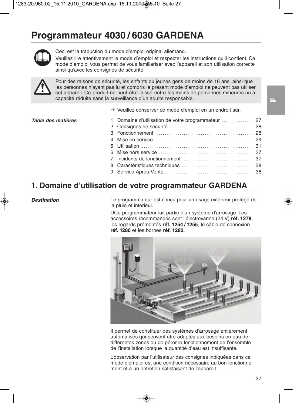 2. Consignes de sécurité 28 3. Fonctionnement 28 4. Mise en service 29 5. Utilisation 31 DCe programmateur fait partie d'un système d'arrosage. Les accessoires recommandés sont l'électrovanne (24 V) réf. 1278, les regards prémontés réf. 1254 / 1255, le câble de connexion réf. 1280 et les bornes réf. 1282.