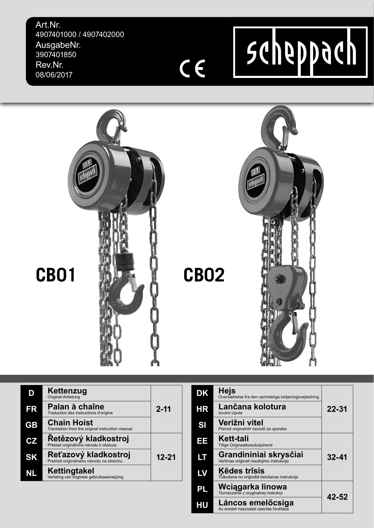 CB01, CB02 - Palan à chaîne SCHEPPACH - Notice d'utilisation et mode d'emploi gratuit
