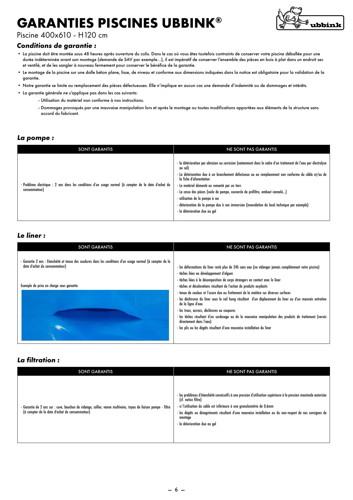Notre garantie se limite au remplacement des pièces défectueuses. Elle n'implique en aucun cas une demande d'indemnité ou de dommages et intérêts.