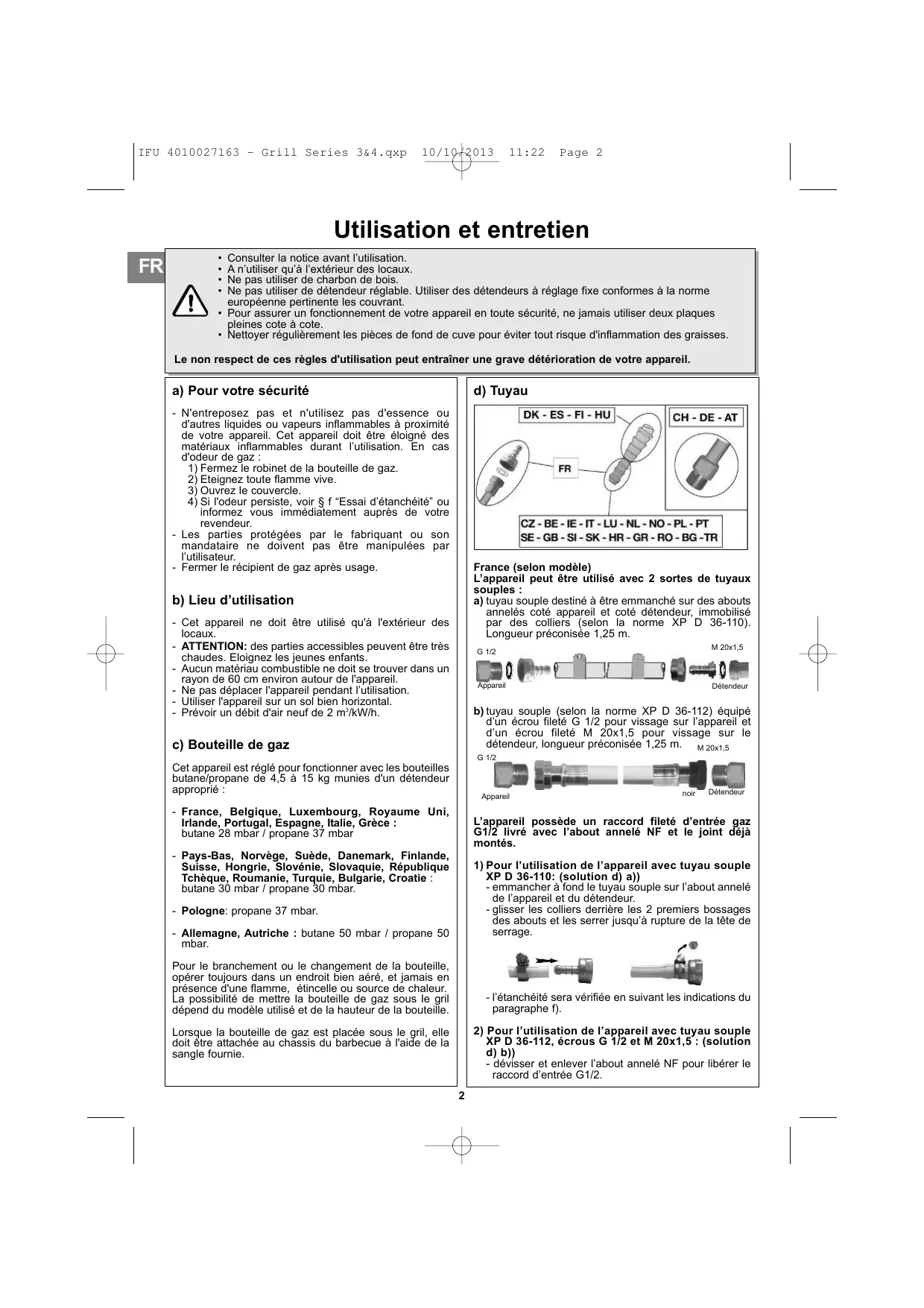 Vérifier l'étanchéité du circuit gaz depuis la bouteille jusqu'au réchaud (voir le paragraphe f). Vérifier l'état du tuyau reliant le gril au réchaud. Le changer en faisant appel au Service Après Vente, s'l présente des craquelures.