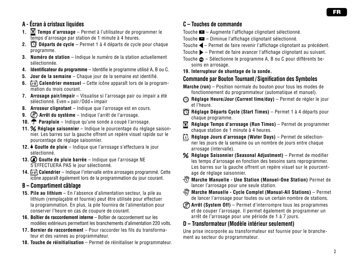 Commande par Bouton Tournant Signification des Symboles Marche (run) — Position normale du bouton pour tous les modes de fonctionnement du programmateur (automatique et manuel). © Réglage Heure/Jour (Current time/day) - Permet de régler le jour et l'heure. e Réglage Départs Cycle (Start Times) — Permet 1 à 4 départs pour chaque programme. Réglage Temps d'arrosage (Run Times) - Permet de programmer chaque station de 1 minute à 4 heures. ê Réglage Jours d'arrosage (Water Days) - Permet de sélection- ner les jours de la semaine ou un nombre de jours entre chaque arrosage (intervalle). % Réglage Saisonnier (Seasonal Adjustment) - Permet de modifier les temps d'arrosage en fonction des besoins sans reprogrammer. Les barres sur la gauche offrent un repère visuel sur le pourcent- age de réglage saisonnier. Marche Manuelle - Une Station (Manuel-One Station) Permet de lancer l’arrosage pour une seule station. & Marche Manuelle - Cycle Complet (Manual-All Stations) - Permet de lancer l’arrosage pour toutes ou un certain nombre de stations @ arrêt {System Off) - Permet d'interrompre tous les programmes et de couper l'arrosage. Il permet également de programmer un arrêt de l’arrosage pour une période de 1 à 7 jours. D - Transformateur (Modèle intérieur seulement) Une prise incorporée au transformateur est fournie pour le branche- ment au secteur du programmateur.