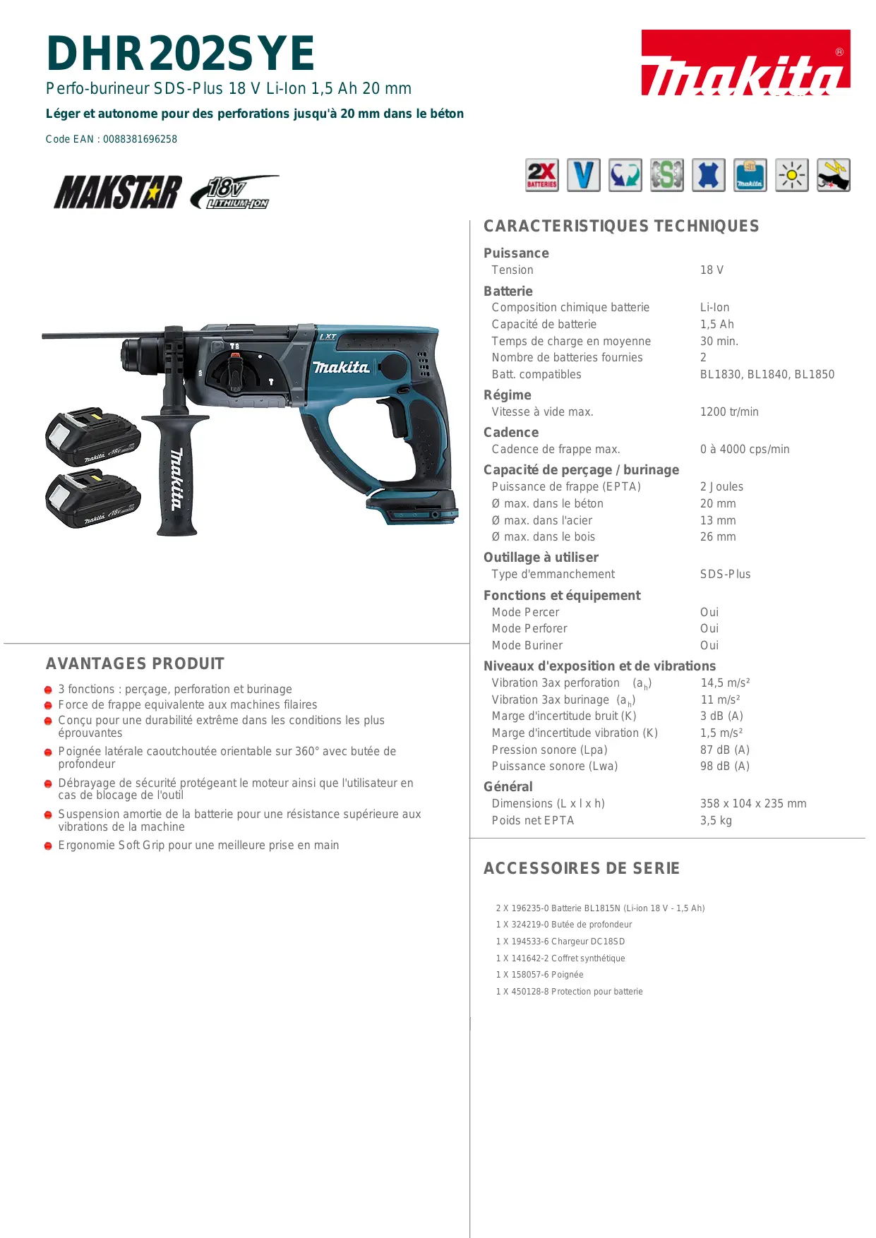 | Informations générales | Garantie de 3 ans sur les outils Makita (sous conditions) |
