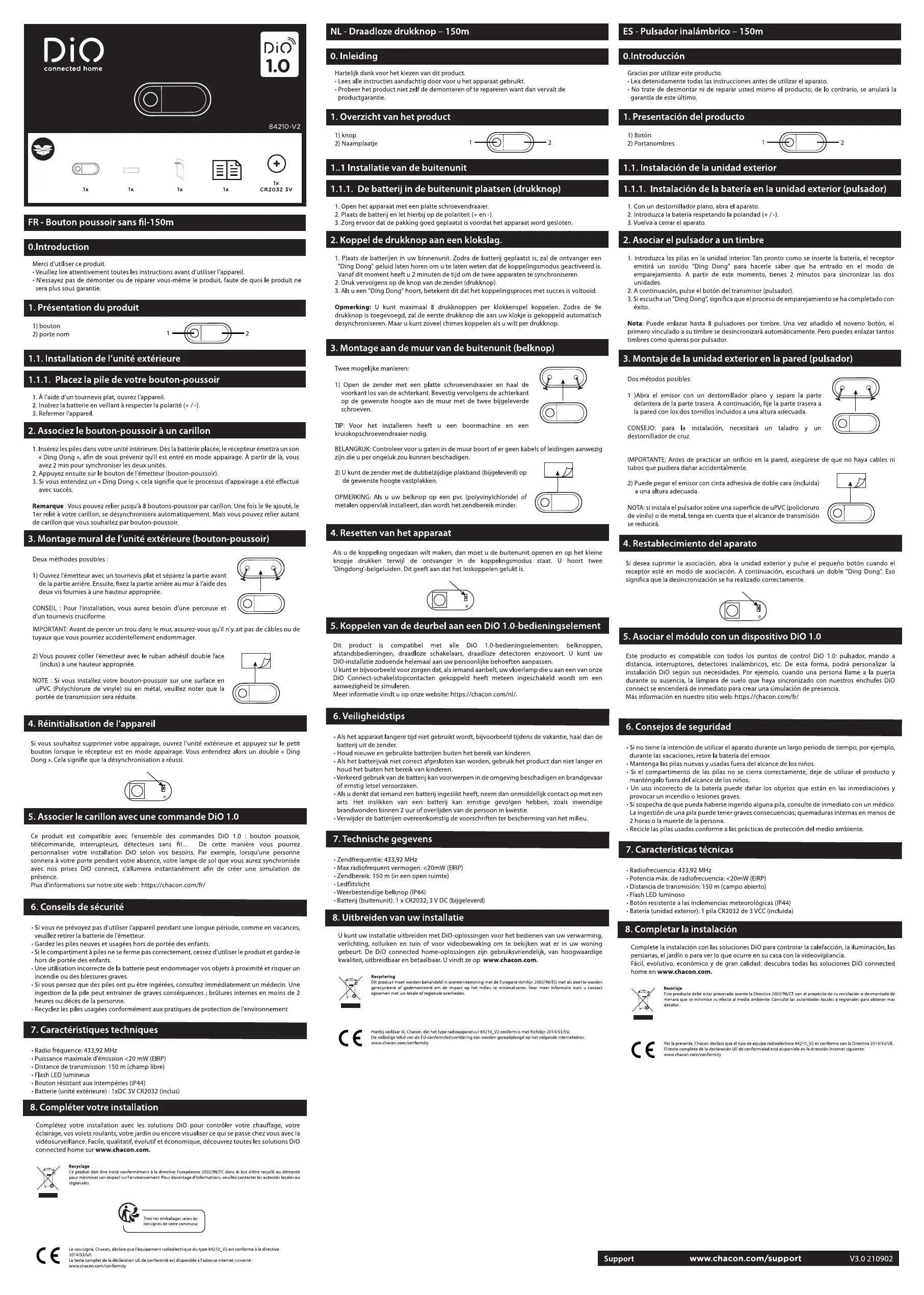 Retrouvez gratuitement la notice de l'appareil BOUTON DE SONNETTE SANS FIL 84210 DIO au format PDF.