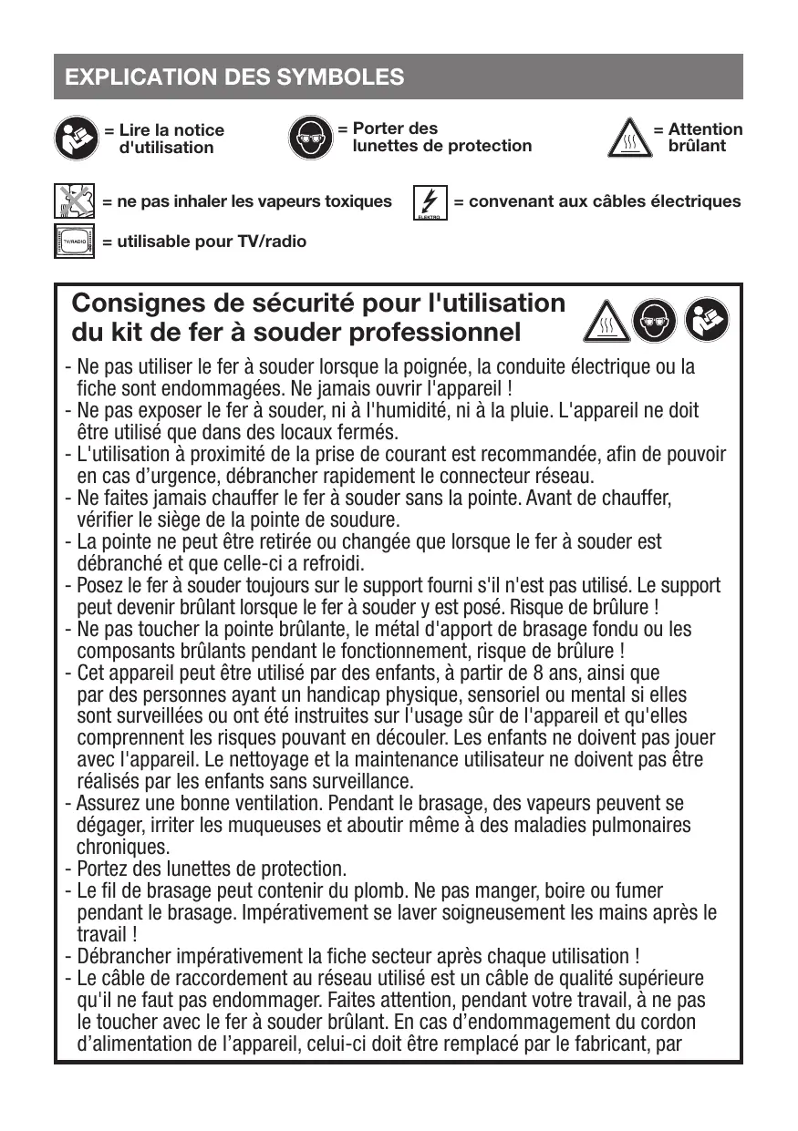 - Le fil de brasage peut contenir du plomb. Ne pas manger, boire ou fumer pendant le brasage. Impérativement se laver soigneusement les mains après le travail !