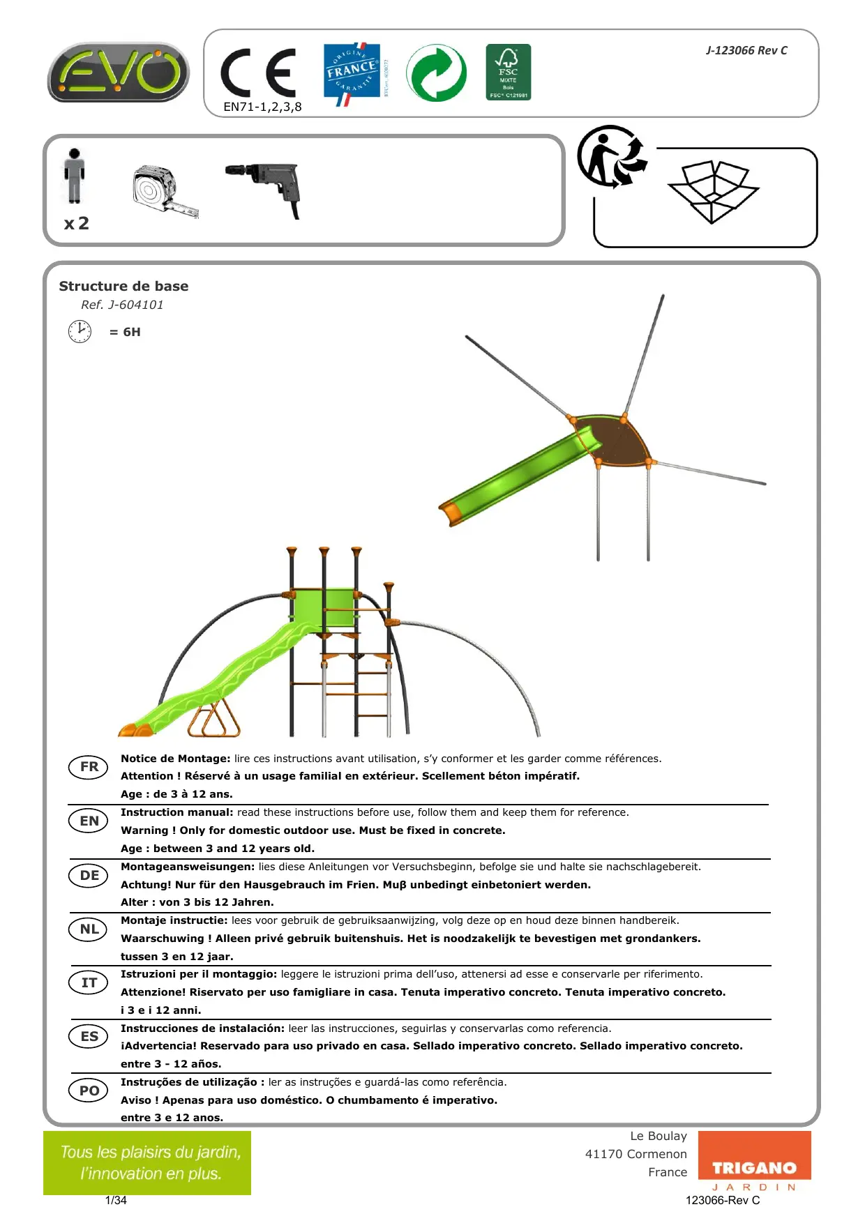 Nous tenons à vous féliciter et à vous remercier pour l'acquisition de la structure de jeu EVO conçue et réalisée par TRIGANO JARDIN. Pour qu'elle soit utilisée dans les meilleures conditions possibles de sécurité, nous vous demandons d'accorder toute votre attention aux différents conseils ci-dessous et de vous reporter aux figures correspondantes qui se situent dans les pages suivantes. Conservez soigneusement cette notice de montage qui peut vous être utile dans l'avenir.