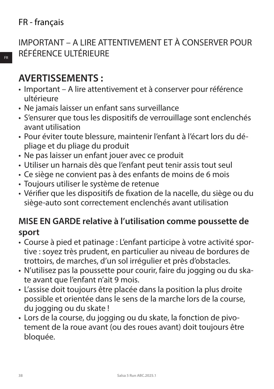 + Vérifier l'intégrité et le fonctionnement de tou- tes les pièces de la poussette avant l'utilisation sportive.
