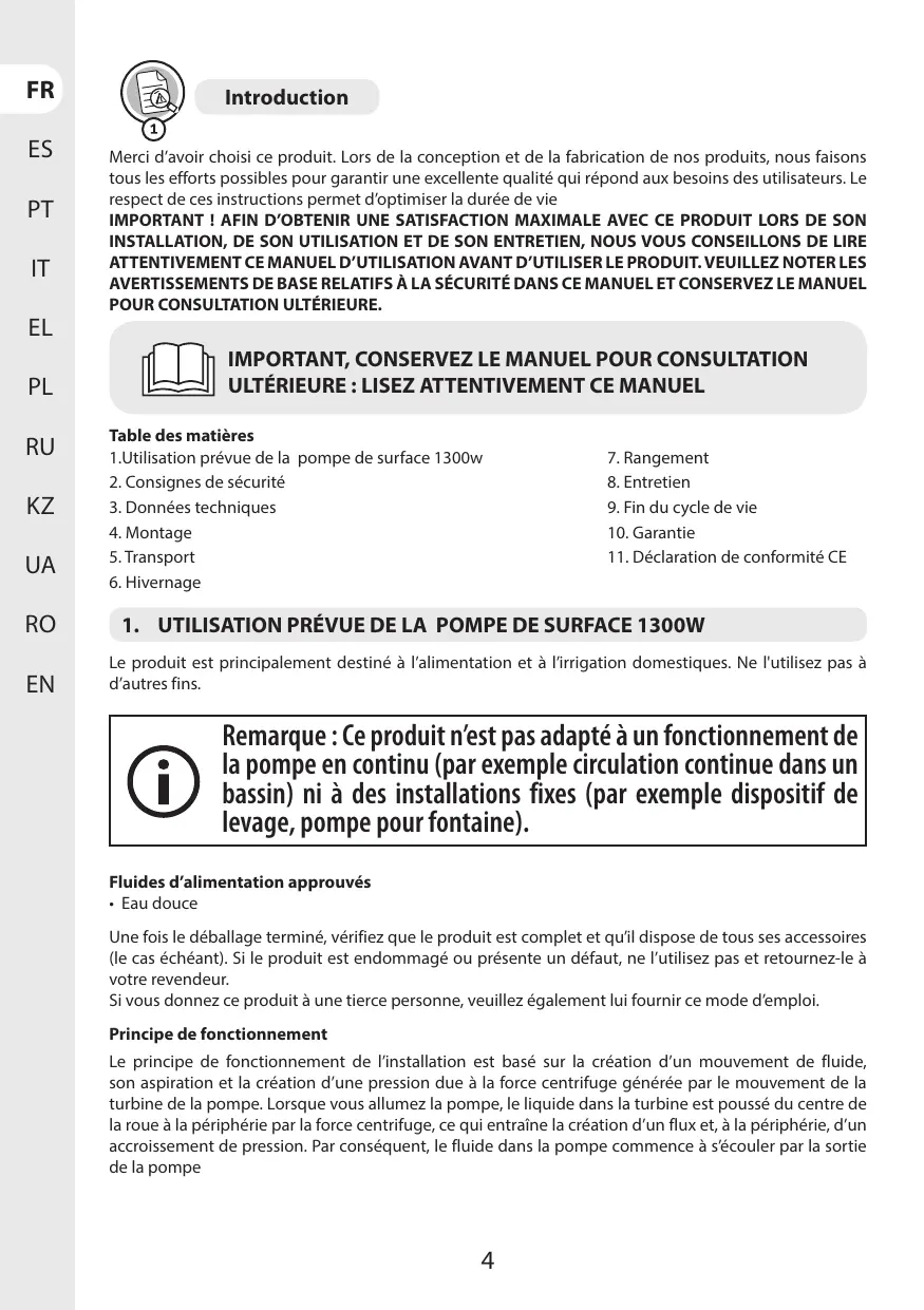 1. UTILISATION PRÉVUE DE LA POMPE DE SURFACE 1300W Le produit est principalement destiné à l'alimentation et à l'irrigation domestiques. Ne l'utilisez pas à d'autres fins