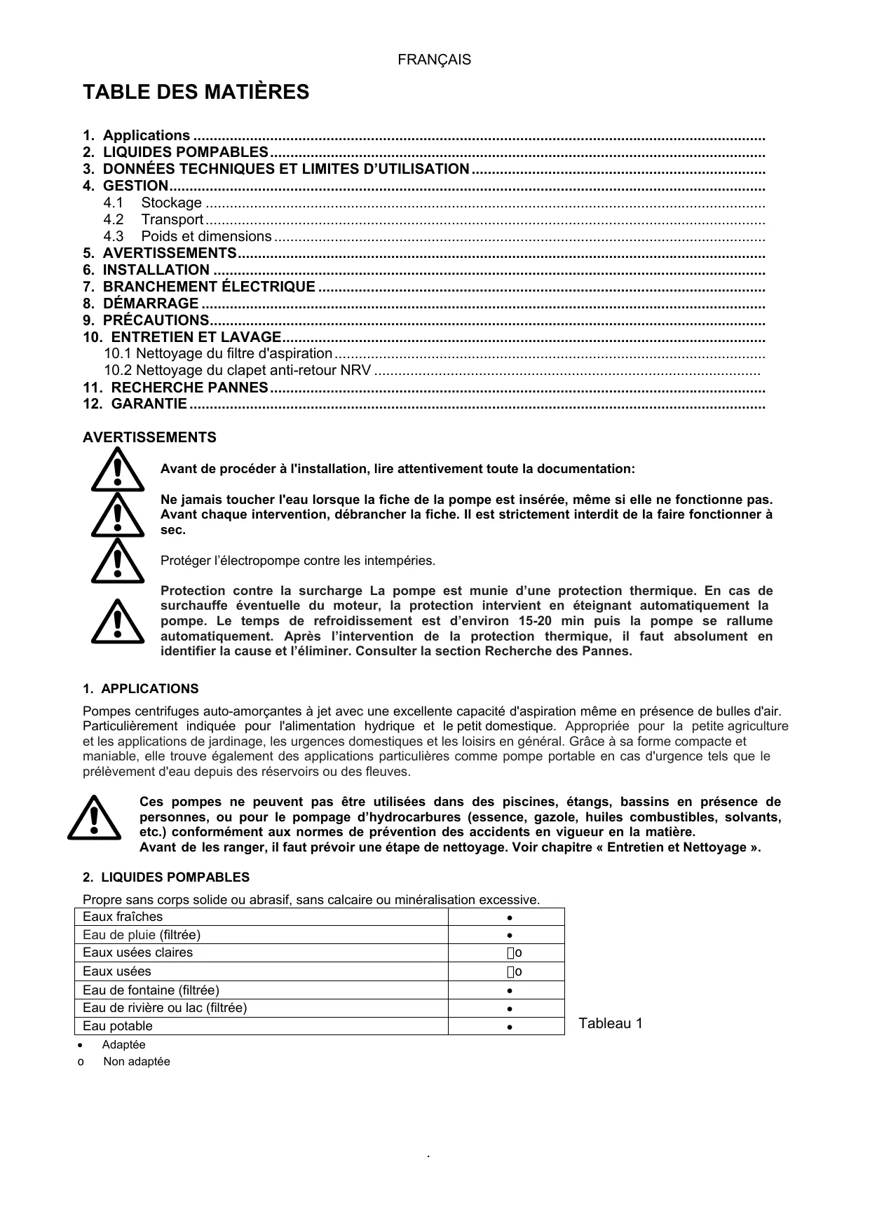 2. LIQUIDES POMPABLES Propre sans corps solide ou abrasif, sans calcaire où minéralisation excessive.