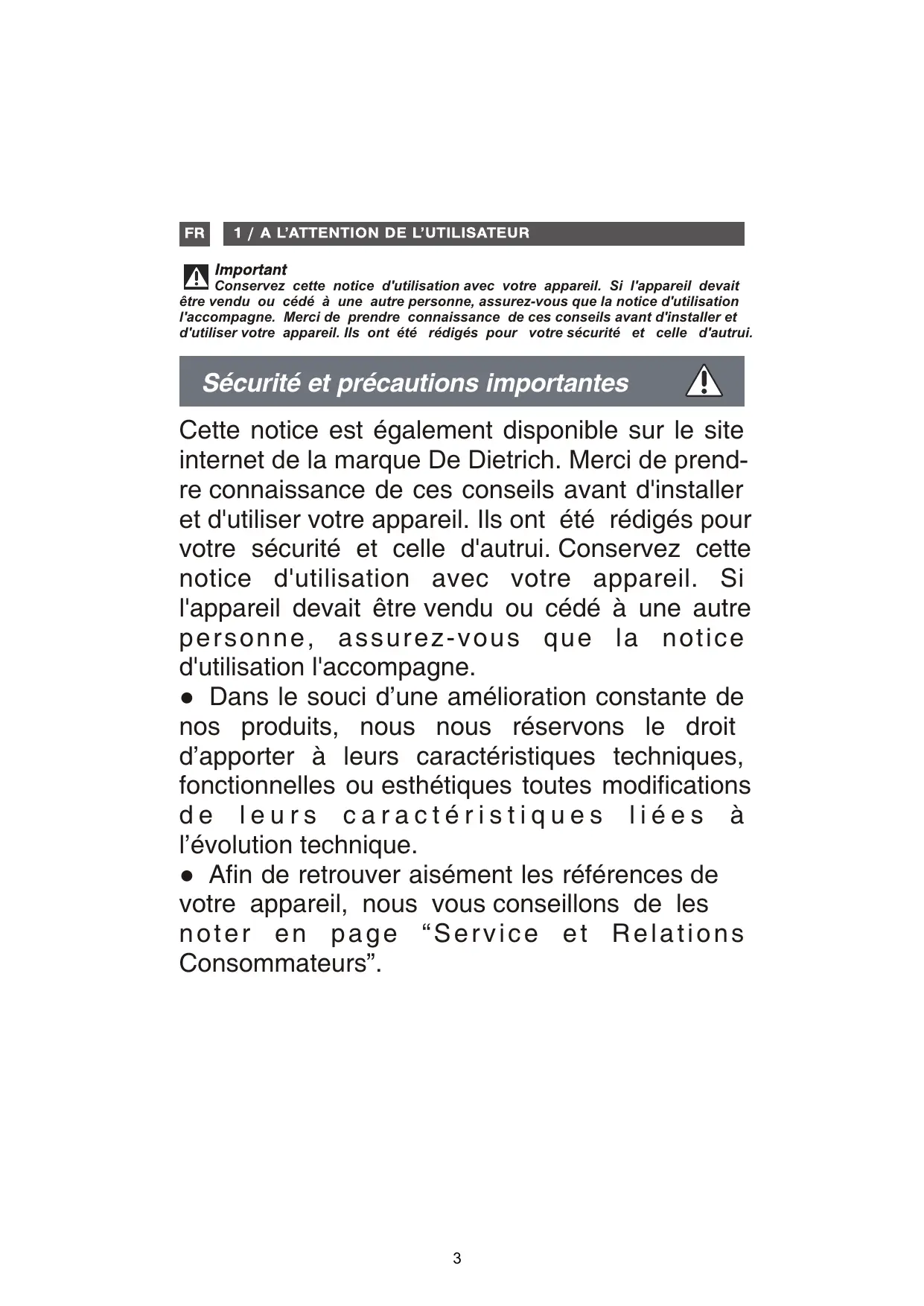A Important Conservez cette notice d'utilisation avec votre appareil. Si l'appareil devait être vendu ou cédé à une autre personne, assurez-vous que la notice d'utilisation l'accompagne. Merci de prendre connaissance de ces conseils avant d'installer et d'utiliser votre appareil. Ils ont été rédigés pour votre sécurité et celle d'autrui. Sécurité et précautions importantes À Cette notice est également disponible sur le site internet de la marque De Dietrich. Merci de prend- re connaissance de ces conseils avant d'installer et d'utiliser votre appareil. Ils ont été rédigés pour votre sécurité et celle d'autrui. Conservez cette notice d'utilisation avec votre appareil. Si l'appareil devait être vendu ou cédé à une autre personne, assurez-vous que la notice d'utilisation l'accompagne. e Dans le souci d’une amélioration constante de nos produits, nous nous réservons le droit d'apporter à leurs caractéristiques techniques, fonctionnelles ou esthétiques toutes modifications de leurs caractéristiques liées à l’évolution technique. e Afin de retrouver aisément les références de votre appareil, nous vous conseillons de les noter en page “Service et Relations Consommateurs”.