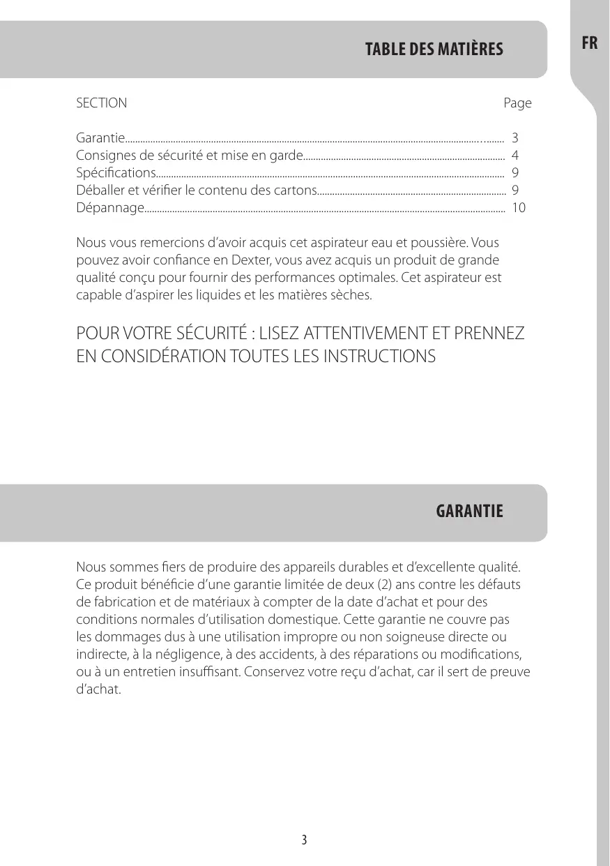 Ce produit bénéficie d'une garantie limitée de deux (2) ans contre les défauts de fabrication et de matériaux à compter de la date d'achat et pour des conditions normales d'utilisation domestique. Cette garantie ne couvre pas