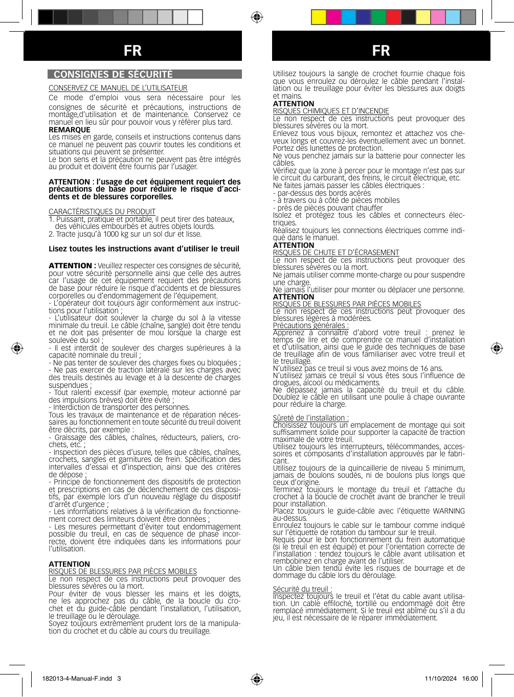 Pour éviter de vous blesser les mains et les doigts, ne les approchez pas du câble, de la boucle du cro- chet et du guide-câble pendant l'installation, l'utilisation, le treuillage ôu le déroulage.