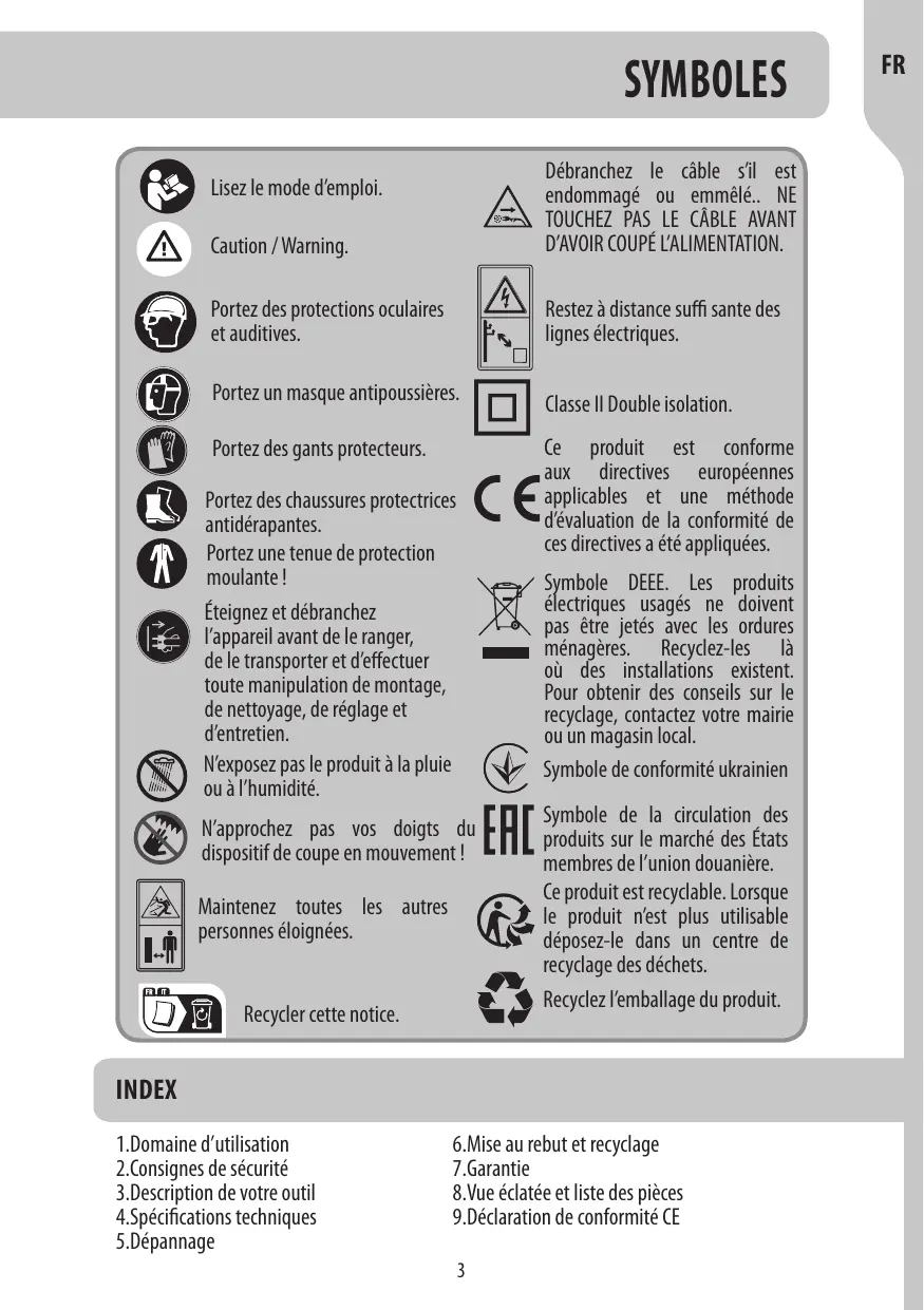 l'appareil avant de le ranger, #” dele transporter et d'effectuer toute manipulation de montage, de nettoyage, de réglage et d'entretien. N'exposez pas le produit à la pluie ou à l'humidité.