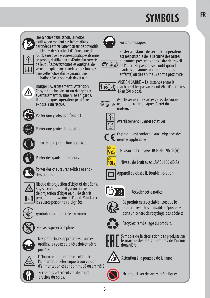 Ce produit est conforme aux exigences des C € normes applicables. FA) Niveau de bruit avec BOBINE : 96 dB(A) Ko:) Niveau de bruit avec LAME : 100 dB(A) O Appareil de casse Il. Double isolation. ü Recydler cette notice < Ce produit est recyclable. Lorsque le @ produit n'est plus utilisable déposez-le dans un centre de recyclage des déchets. 4e, ; Recydez l'emballage du produit. LA x) J ge du pr le marché des États membres de l'union FA [ Symbole de la circulation des produits sur douanière. Attention à la poussée de la lame d'alimentation est endommagé ou emmêlé. Porter des vêtements protecteurs proches du corps. Ne pas utiliser de lames métalliques