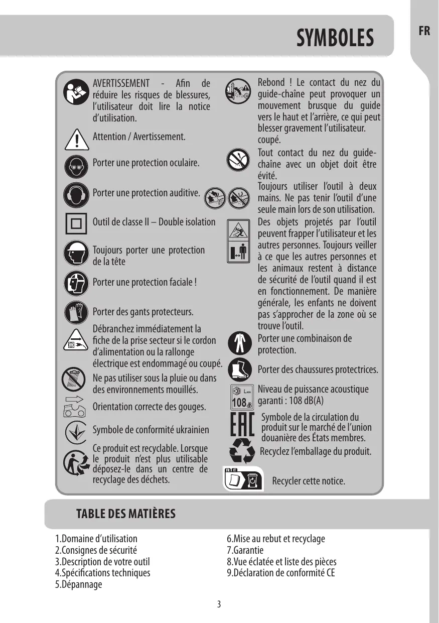 AVERTISSEMENT - Afin de réduire les risques de blessures, l'utilisateur doit lire la notice d'utilisation. Attention / Avertissement. Porter une protection oculaire. Outil de classe 11 — Double isolation Toujours porter une protection de la tête Porter une protection faciale ! Porter des gants protecteurs. Débranchez immédiatement la fiche de la prise secteur si le cordon d'alimentation ou la rallonge électrique est endommagé ou coupé. Ne pas utiliser sous la pluie ou dans des environnements mouillés. Orientation correcte des gouges. Symbole de conformité ukrainien C produit est recyclable. Lorsque le produit n'est plus utilisable déposez-le dans un centre de recyclage des déchets. © Porter une protection auditive. GIS]