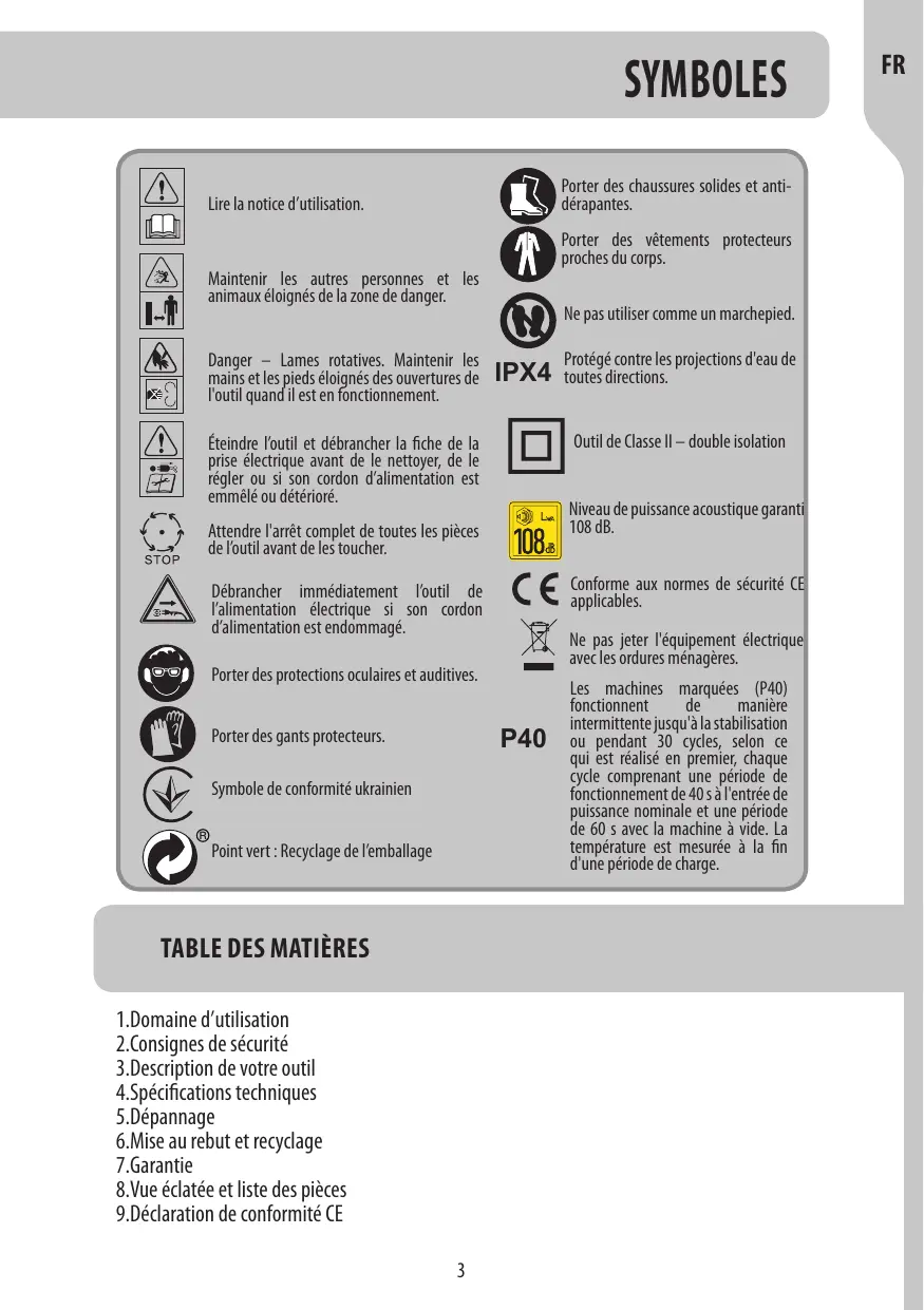 2.Consignes de sécurité 3.Description de votre outil 4.Spécifications techniques 5.Dépannage